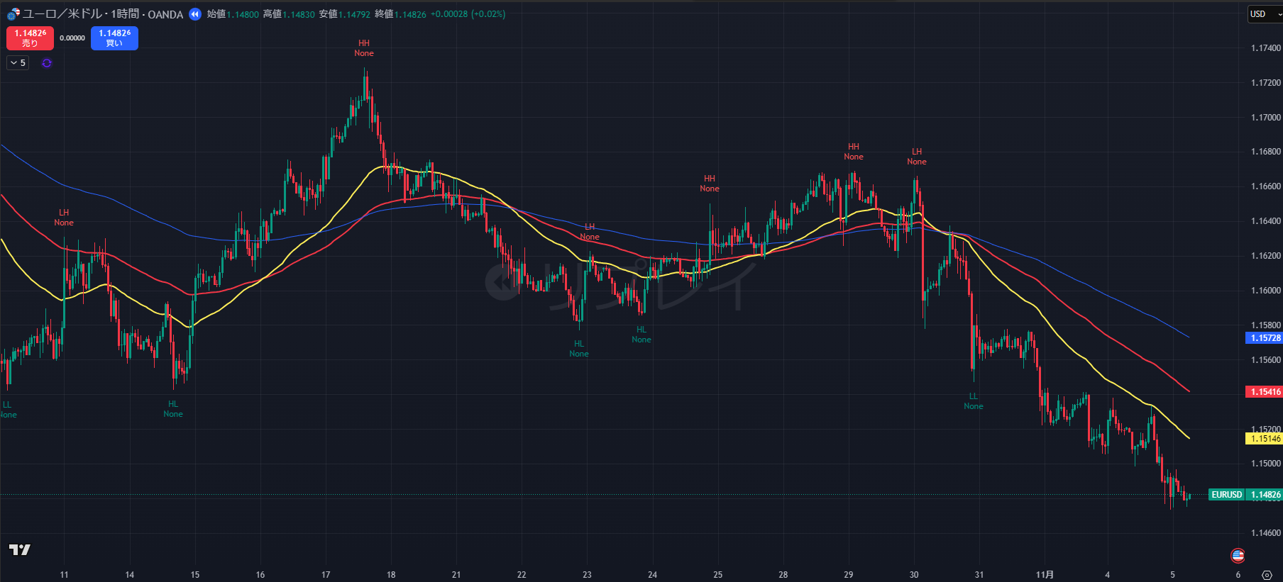 - 攻防: ブレイク直後、一時 1.1517 まで戻す場面がありましたが、SL(1.1555)には届かず、ダウ理論上の「安値更新後の戻り」として許容範囲内でした。
