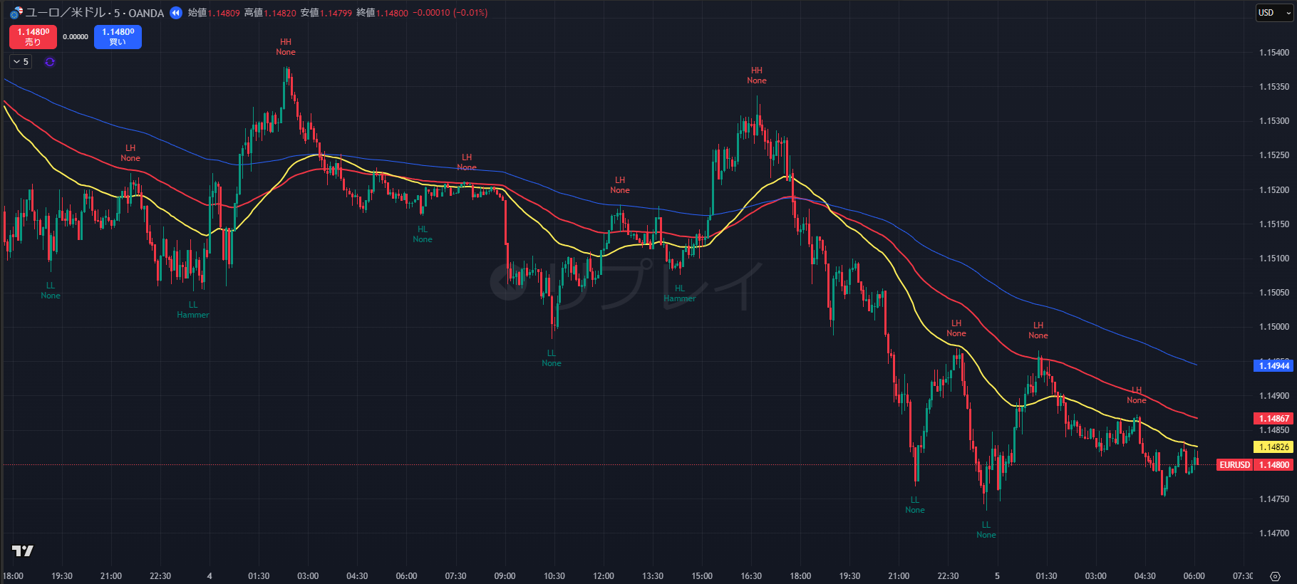 - 利確: その後、NY時間にかけてじりじりと値を下げ、本日早朝(05:05)に安値 1.1475 を記録。第一利確目標である 1.1480 を達成しました。