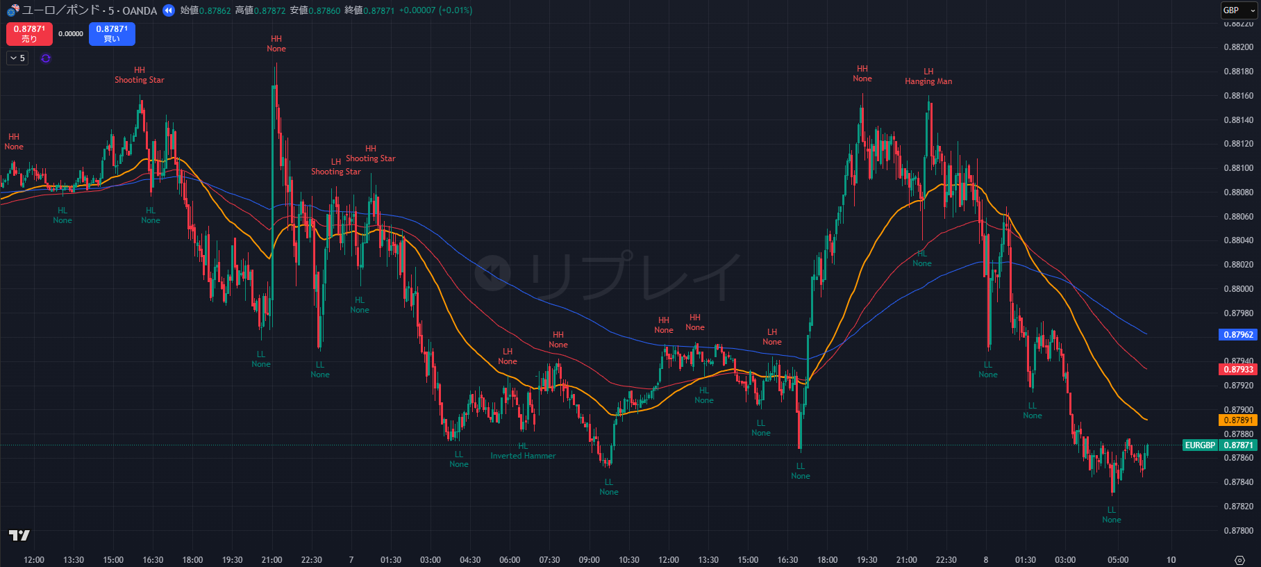 - 戻り売りの場合: 0.8800付近まで上昇後、5分足で「長い上ヒゲ」や「包み足」が出現し、再度0.8795を割り込んだ瞬間にエントリー。