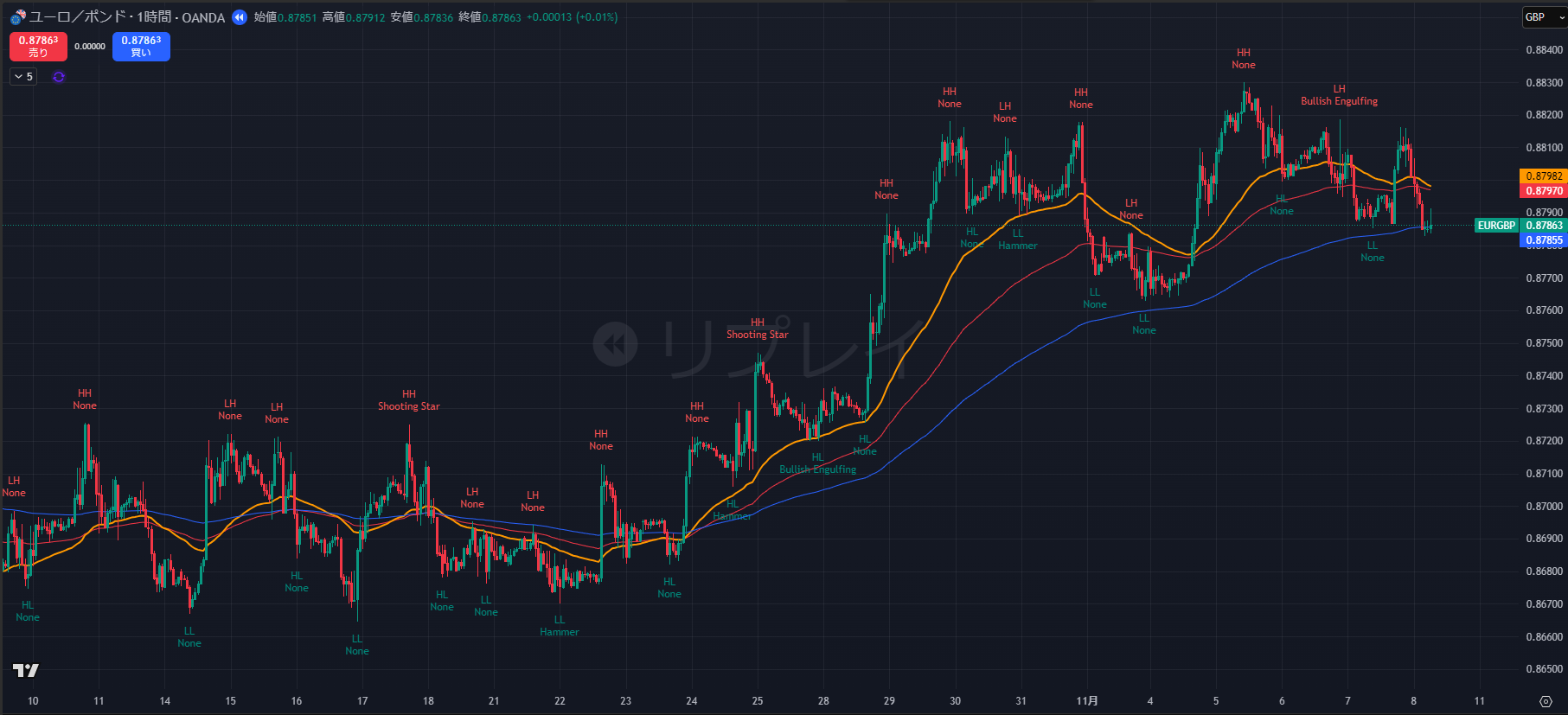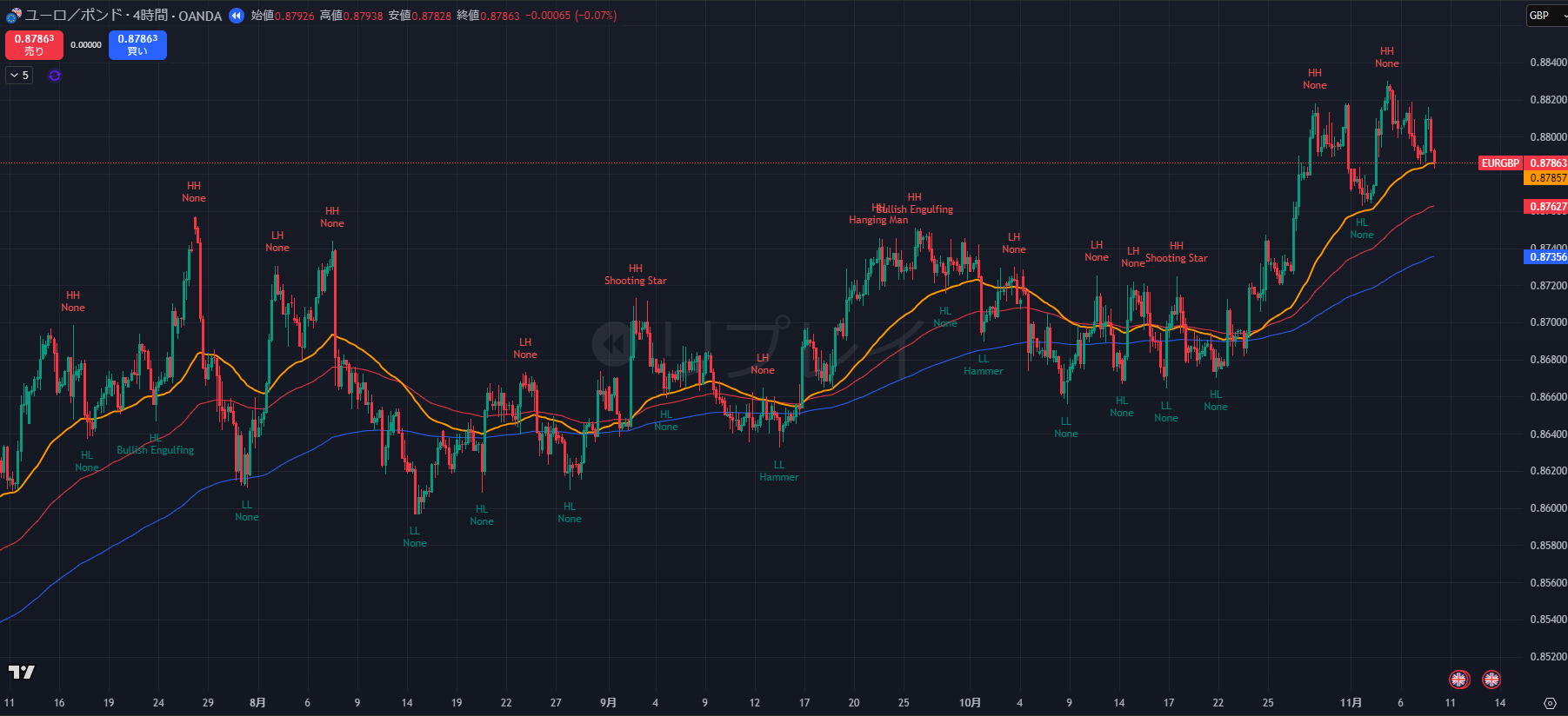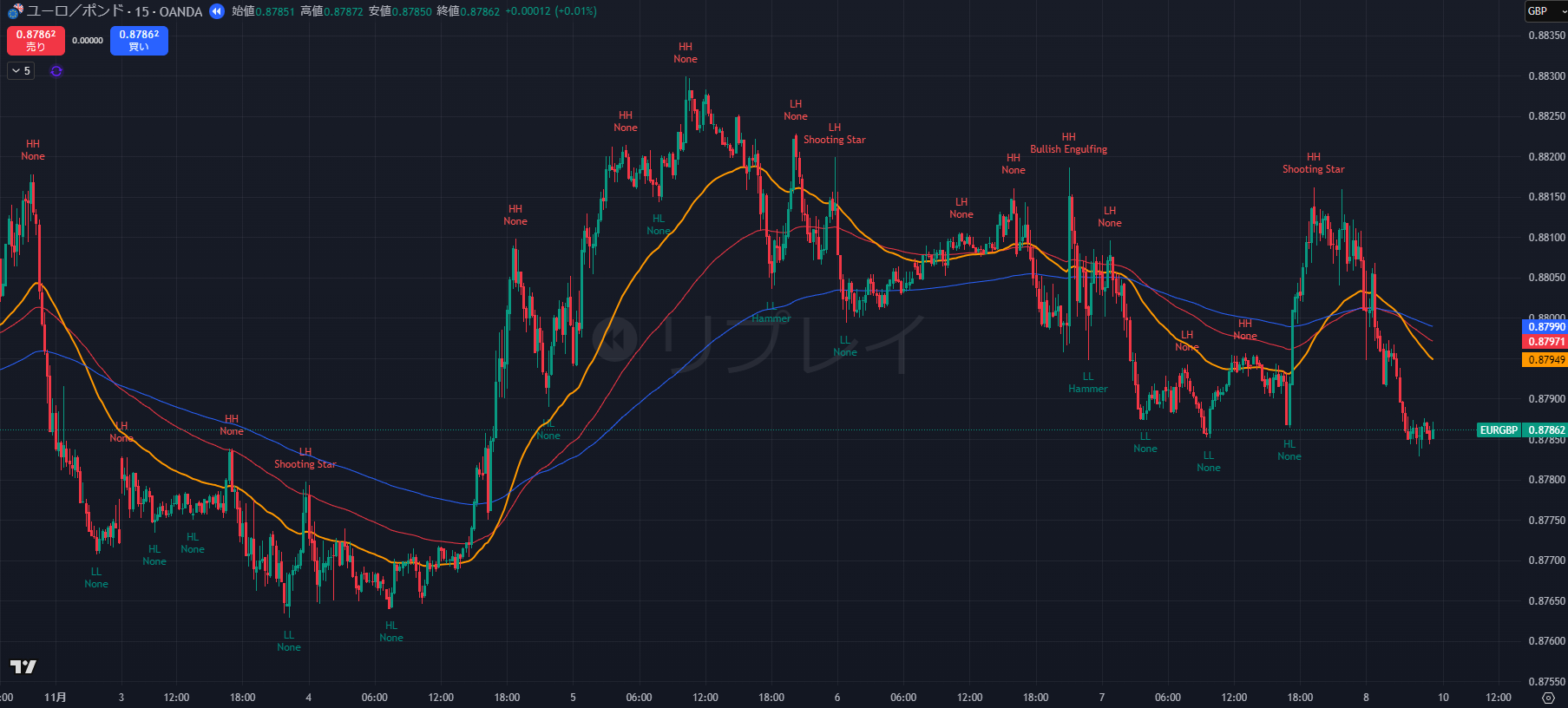 - Swing High (戻り高値): 0.8814 (11/07 10:00頃)