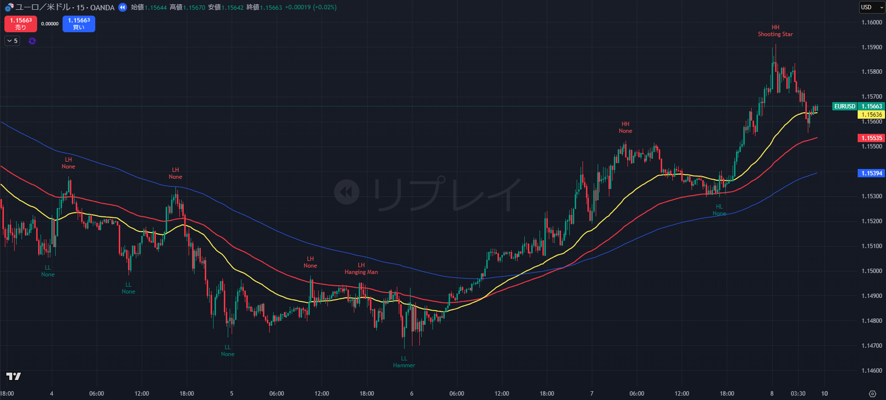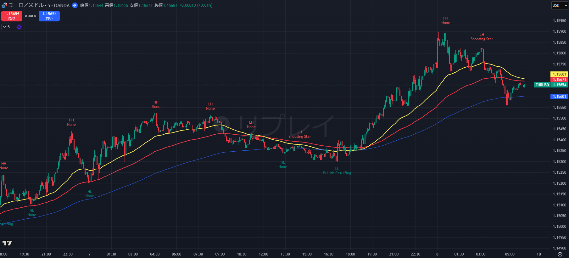 - 1.1550ゾーンまで引きつけた後、5分足で 「包み足 (Bullish Engulfing)」 または 「逆三尊の右肩」 形成を確認してエントリー。