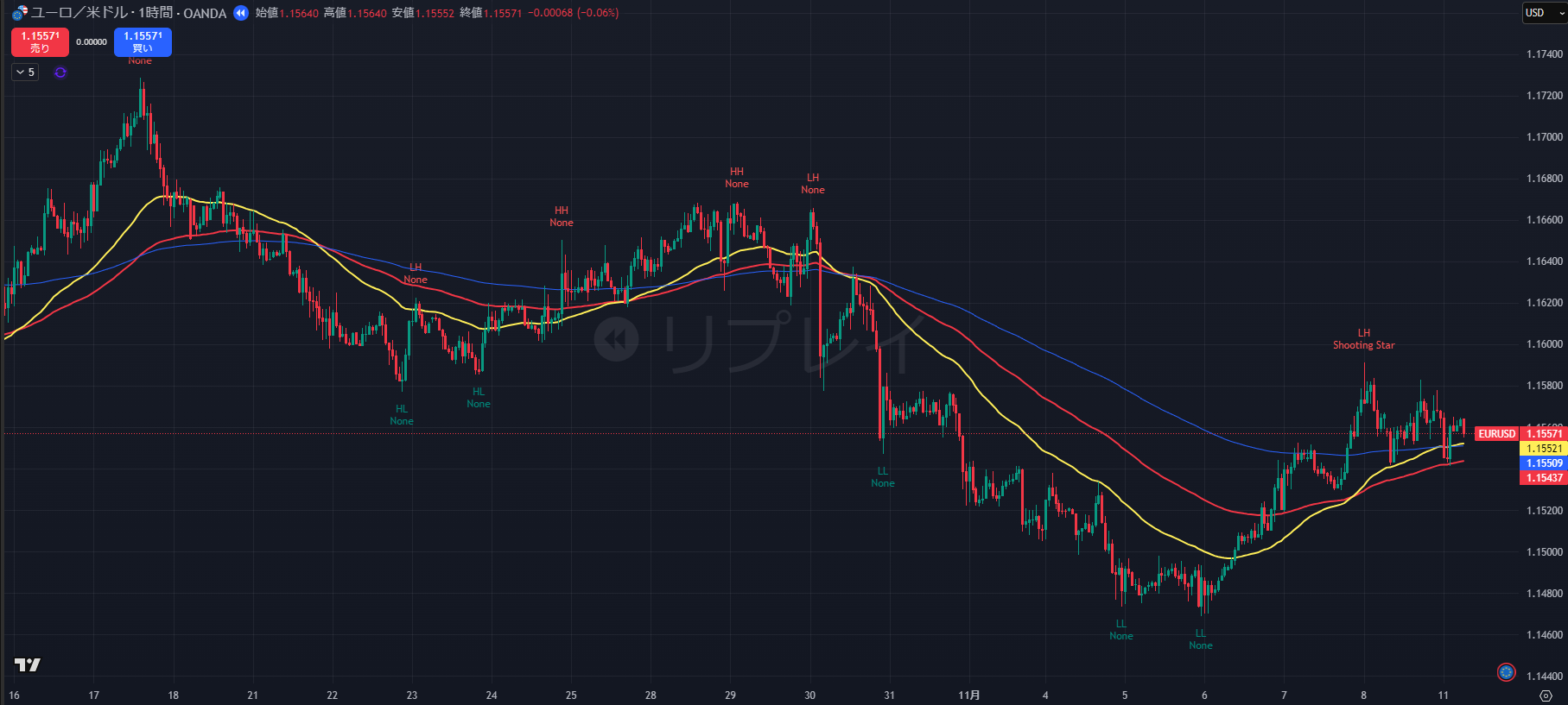 - 1.1550にタッチするとヒゲを出して反発する動きが何度も確認できています。これは大口(Smart Money)がこの価格帯を意識している証拠ですが、同時に「買い圧力が弱い」ことも示唆しています。