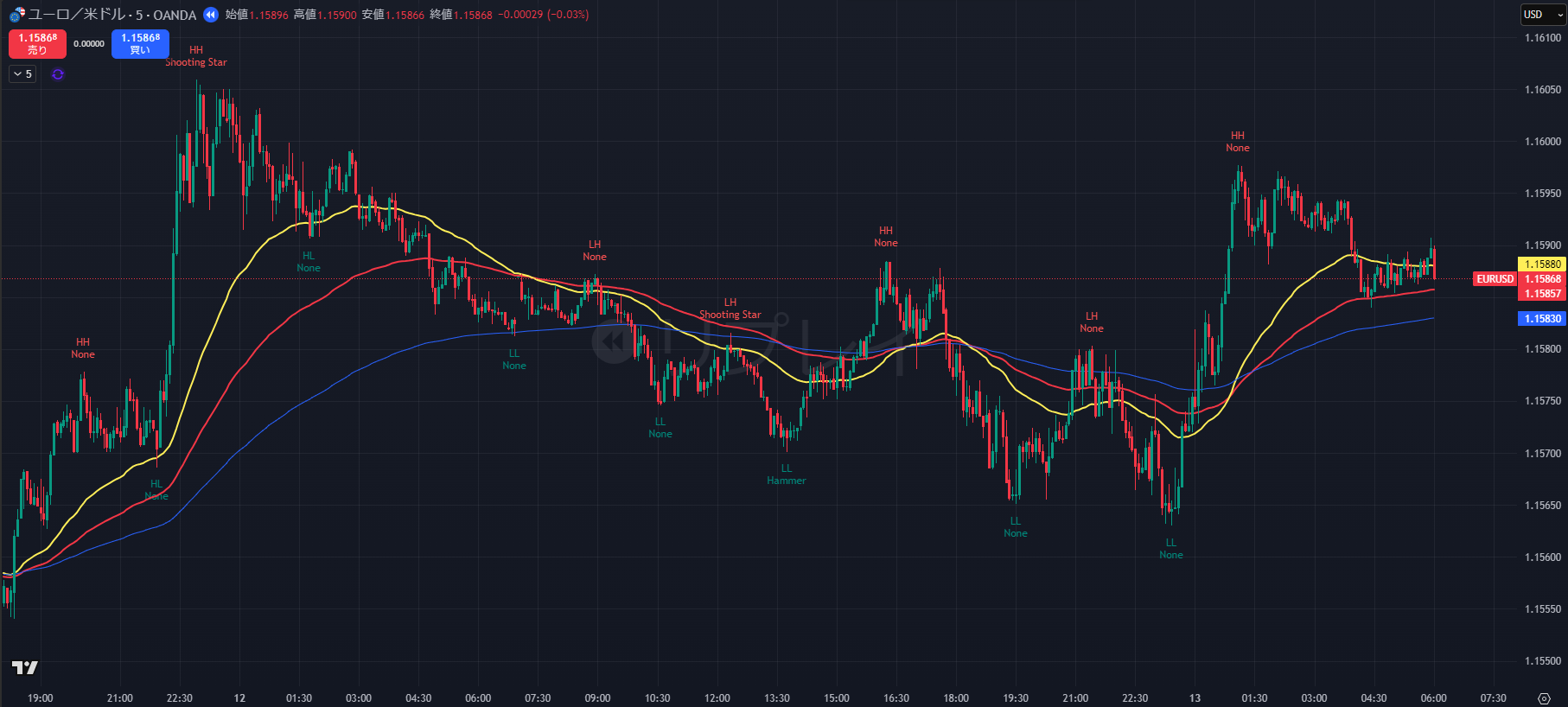- 浅い押し目: 1.1585付近まで下落し、5分足で「下ヒゲ陽線」または「包み足」が出現したらエントリー。