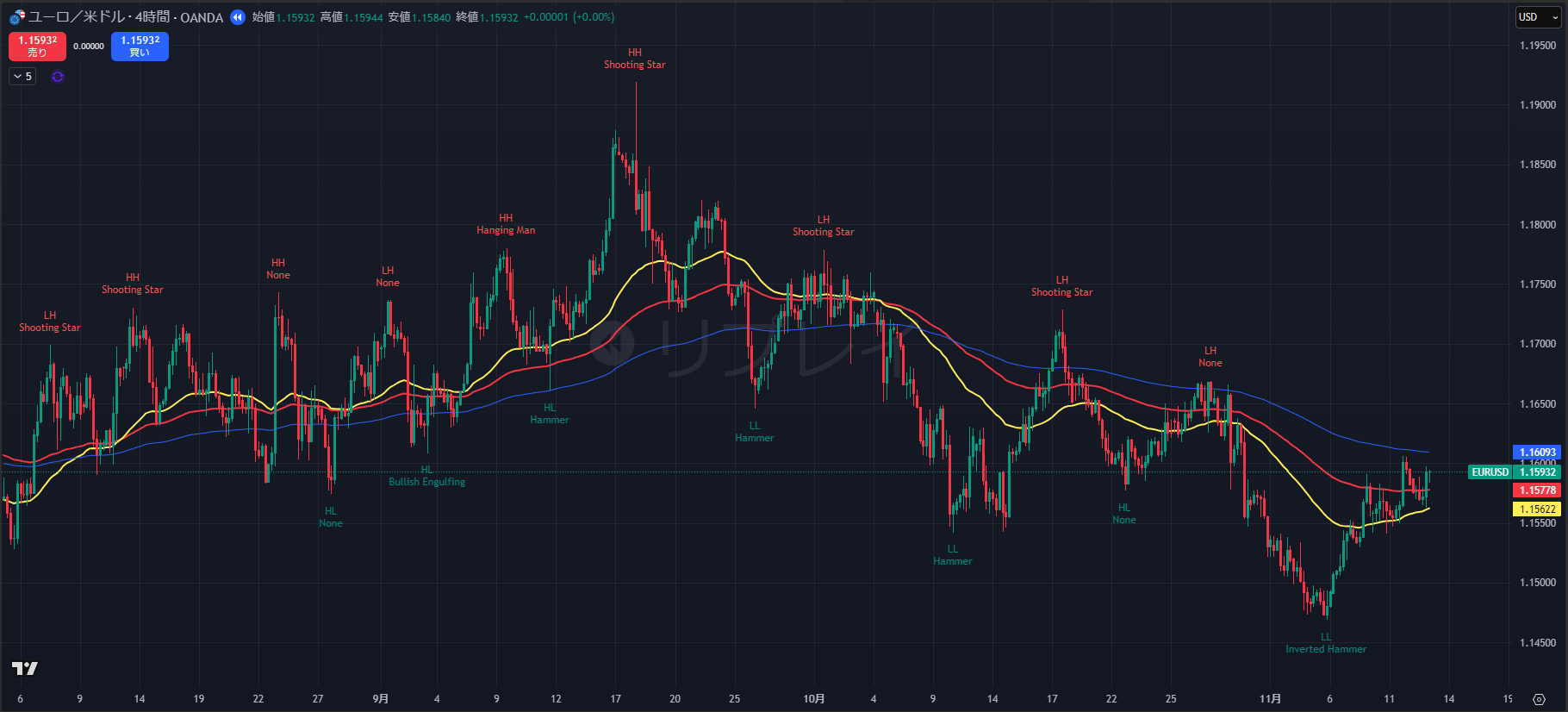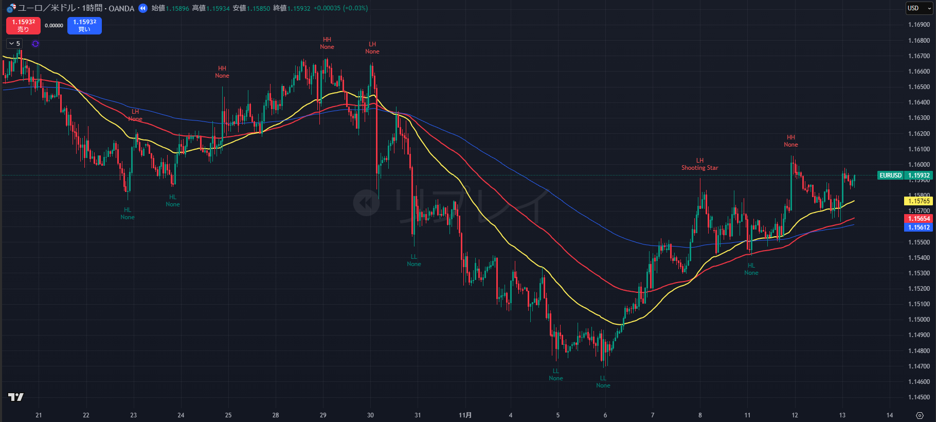 - 4時間足: 1.1547(11/11安値)→ 1.1565(11/12安値)と明確にHigher Low (HL) を形成中。高値も1.1580から1.1594(今朝未明)へと更新しており、ダウ理論上、上昇トレンドは継続しています。
