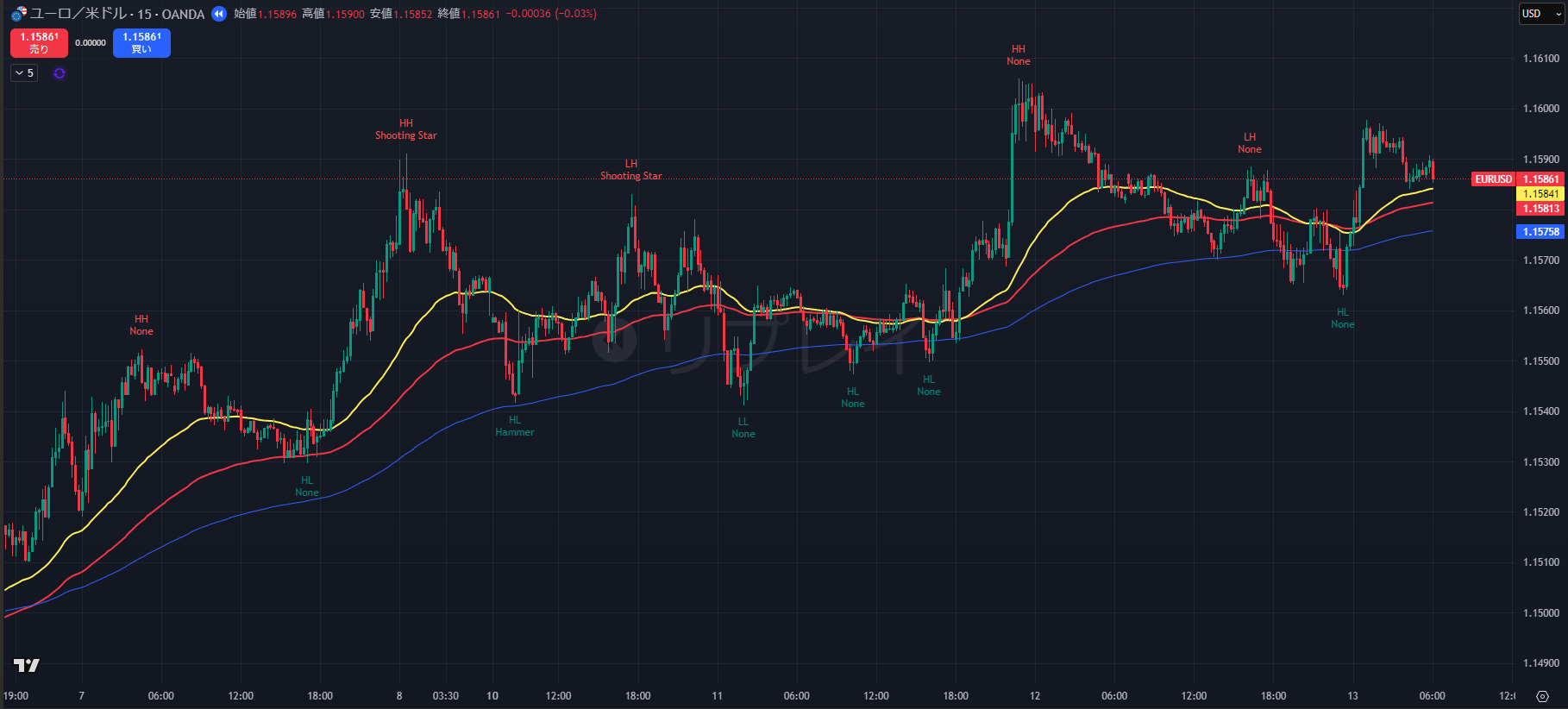 - 15分足では、昨日の戻り高値である1.1580を実体で上抜け(BOS)、上昇トレンド回帰を確定させました。
