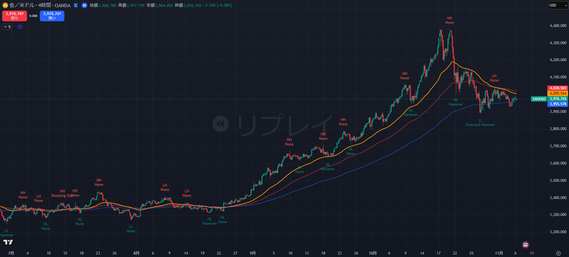 - 現在価格はこのゾーンに張り付いています。ここを実体で明確に上抜けると、次は4000ドルのリテストを目指す展開となります。逆にここで頭を抑えられれば、再度レンジ下限(3950)への回帰が見込めます。