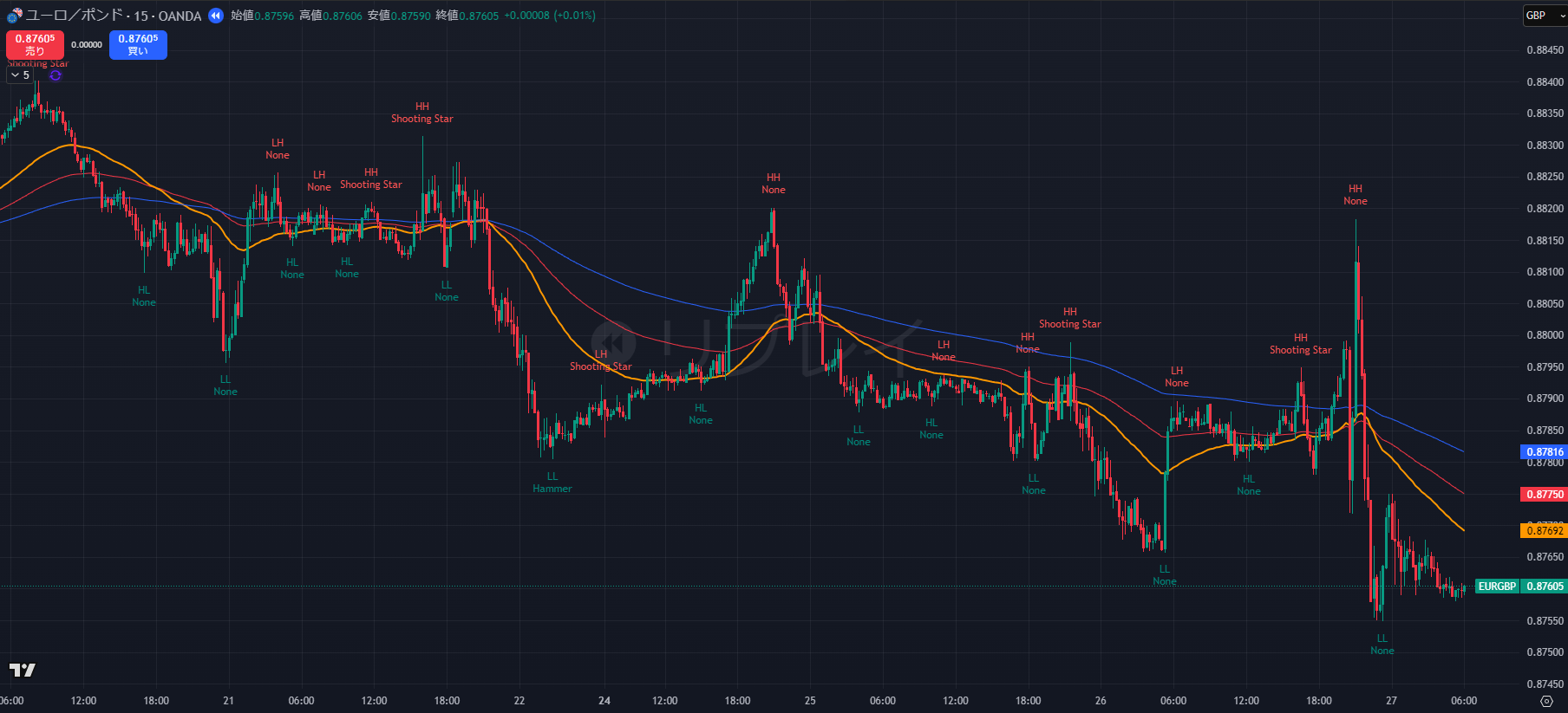 解説: 昨日はロンドンオープン前に0.8792の高値をつけ、推奨エントリーゾーン(0.8780-90)に到達しました。その後、ダウ理論通りに1時間足レベルのラスト押し安値を割り込み、安値0.8758までスムーズに下落しました。 TPの0.8745にはわずかに届きませんでしたが、主要なサポート手前での反発挙動(15分足での下ヒゲ連発)が見られたため、十分な利益を確保できたトレードでした。