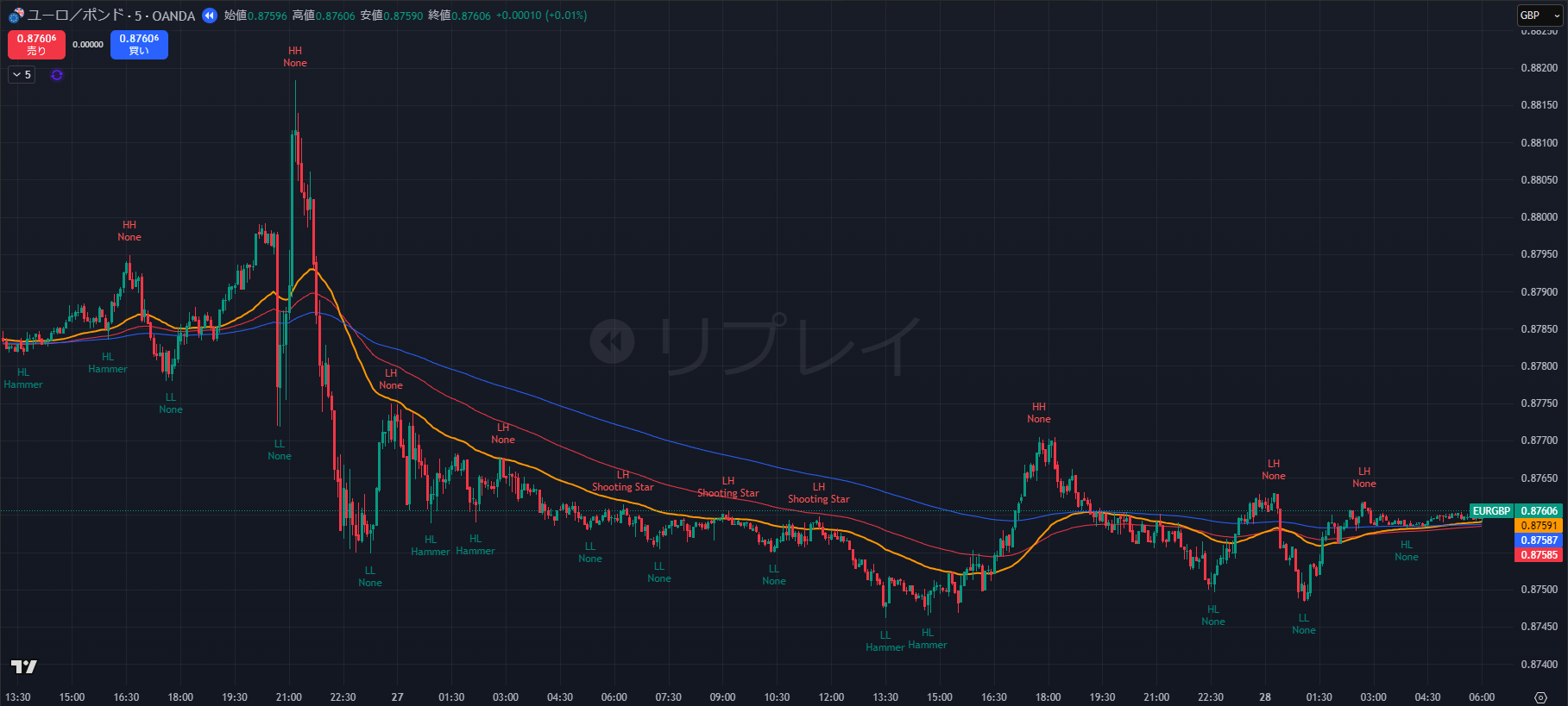 - 5分足では微細なレンジを形成中。0.8765付近が短期的なピボット(Pivot)として機能しており、ここを挟んで上下しています。