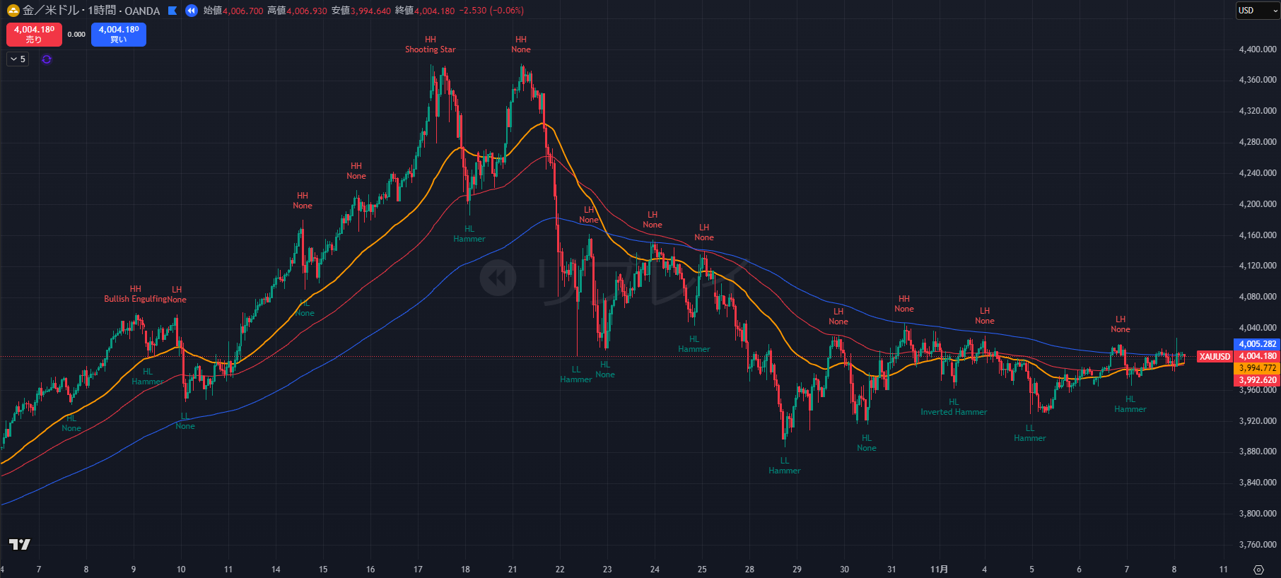 - 攻防ライン: 3990 – 4000ドル 4025ドルからの下落波動が続いていますが、4000ドル付近で下げ渋っています。ここを明確に割り込むと、上昇の起点となった3980ドル付近までの深押しが想定されますが、現時点では「調整の範囲内」に留まっています。