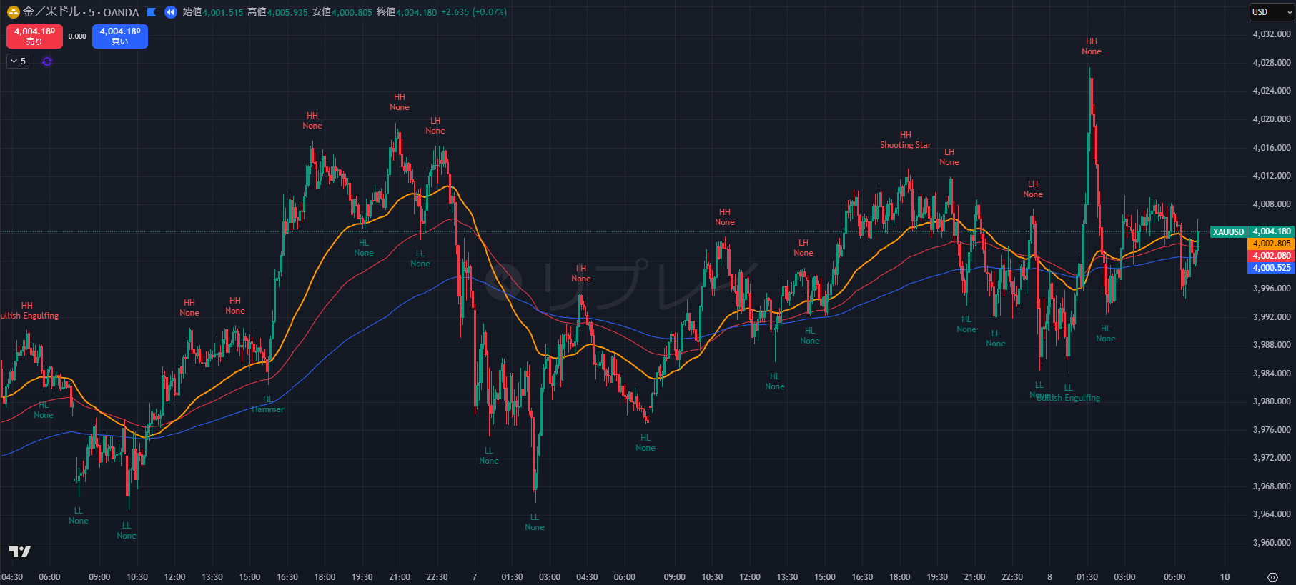- エントリートリガー: 5分足で「3995-3998」付近への急落後、すぐにヒゲで戻すプライスアクションを確認したいところです。