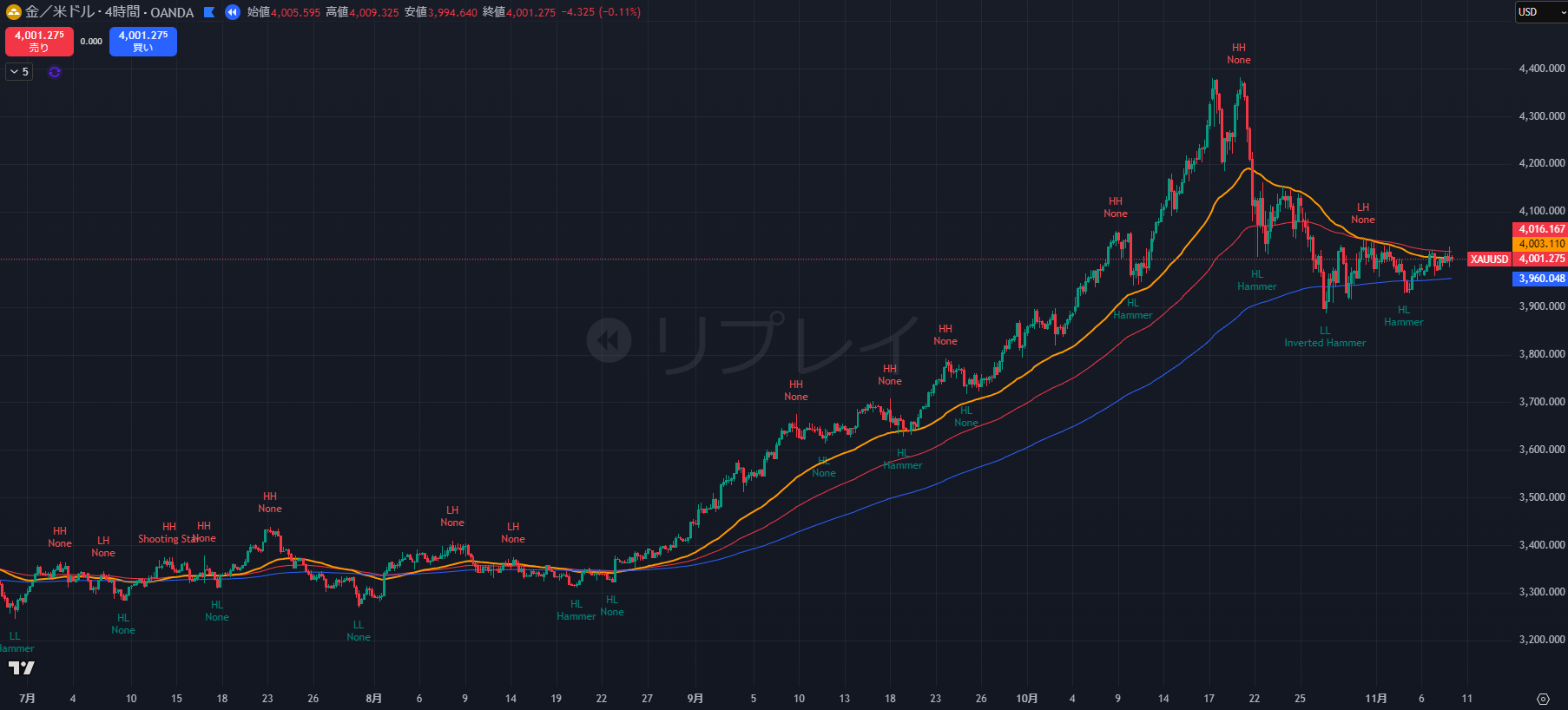 - 狙い: 4H上昇トレンド継続。4000ドル・サポレジ転換での反発狙い。
