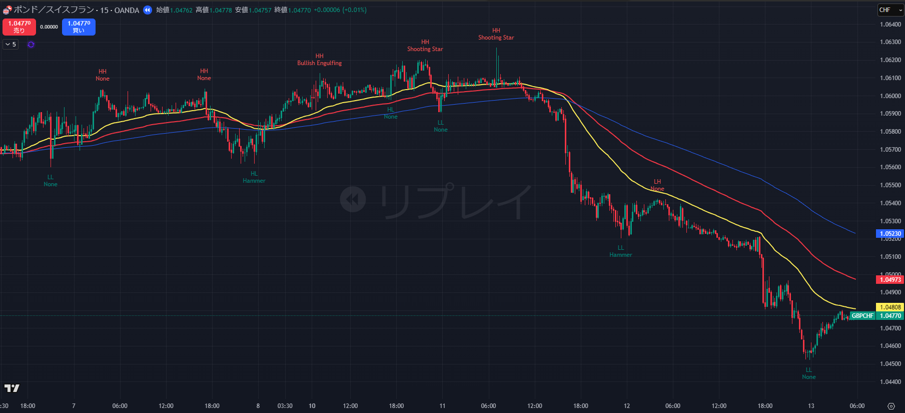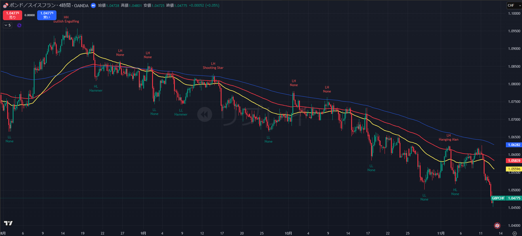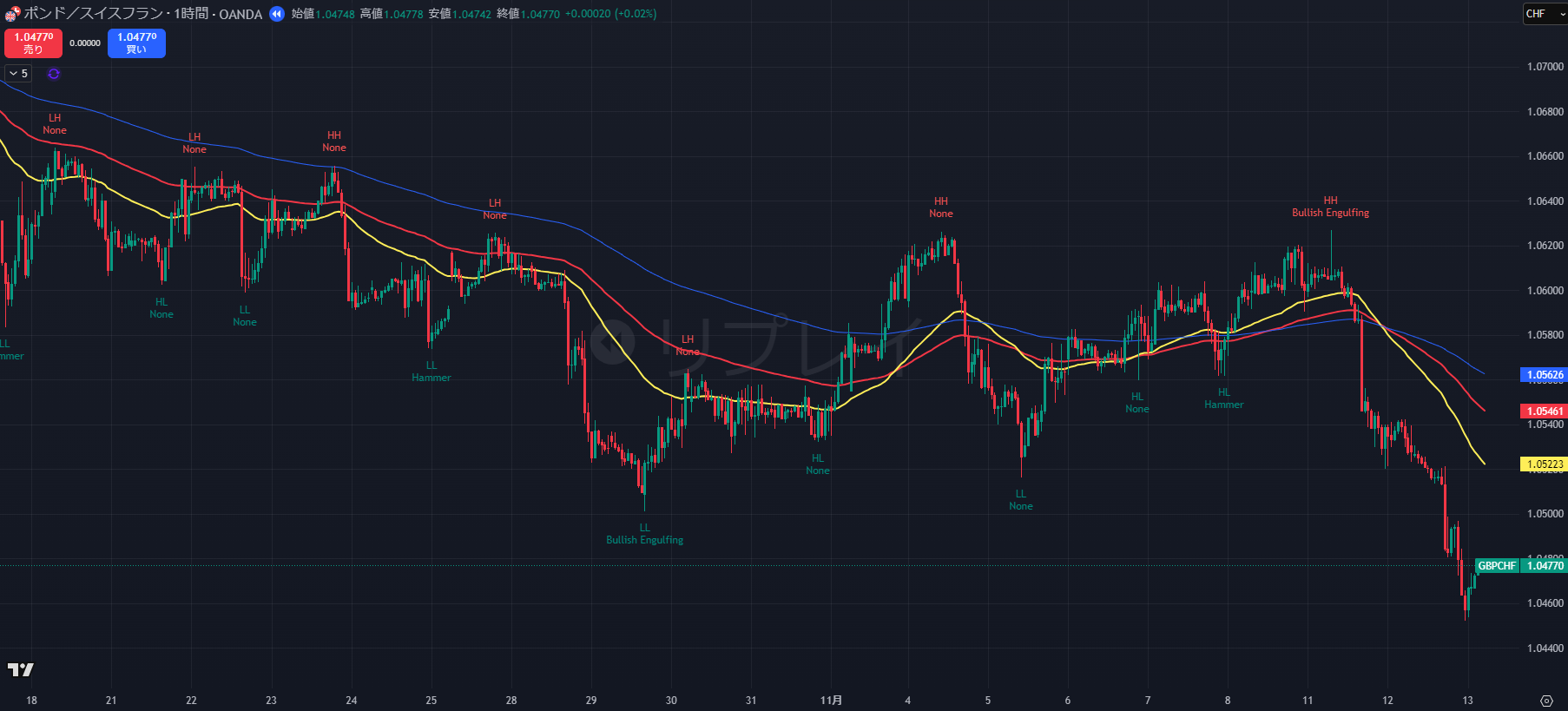 - その後、価格は急落し、11/13早朝には安値 1.0472 を記録。