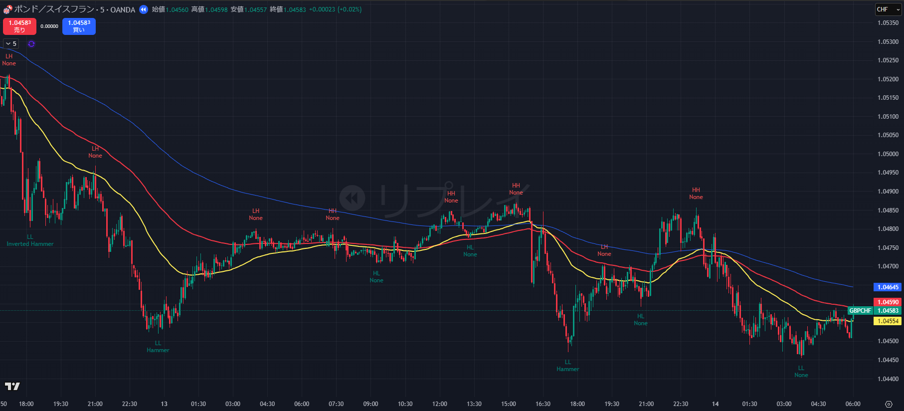 - チャートパターン: 現在、1.0455の安値と、1.0470の戻り高値を結ぶような**短期的なレンジ(揉み合い)**を形成しており、明確なチャートパターンはまだ形成されていません。
