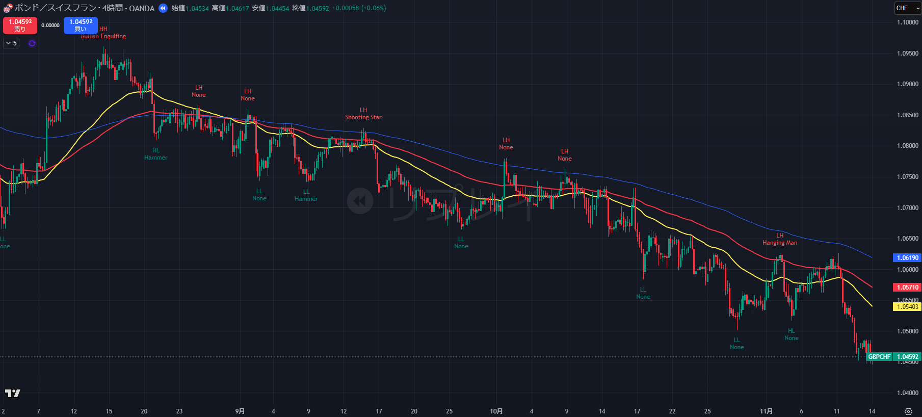 - 本日の相場全体のまとめ: GBP/CHFは4時間足で下降トレンドが継続中であり、現在は強い下落後の調整局面(一時的な戻り)にあります。大局の目線は依然としてショートで、1.0560のラスト戻り高値を背にした戻り売り戦略が最も優位性が高いと判断します。短期足の1.0470付近の攻防が本日の焦点です。