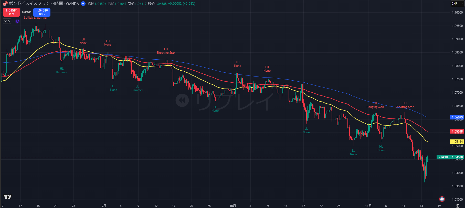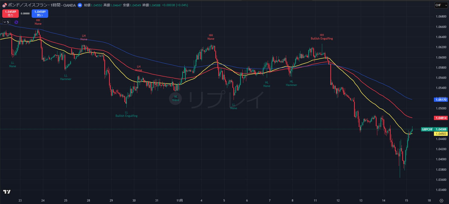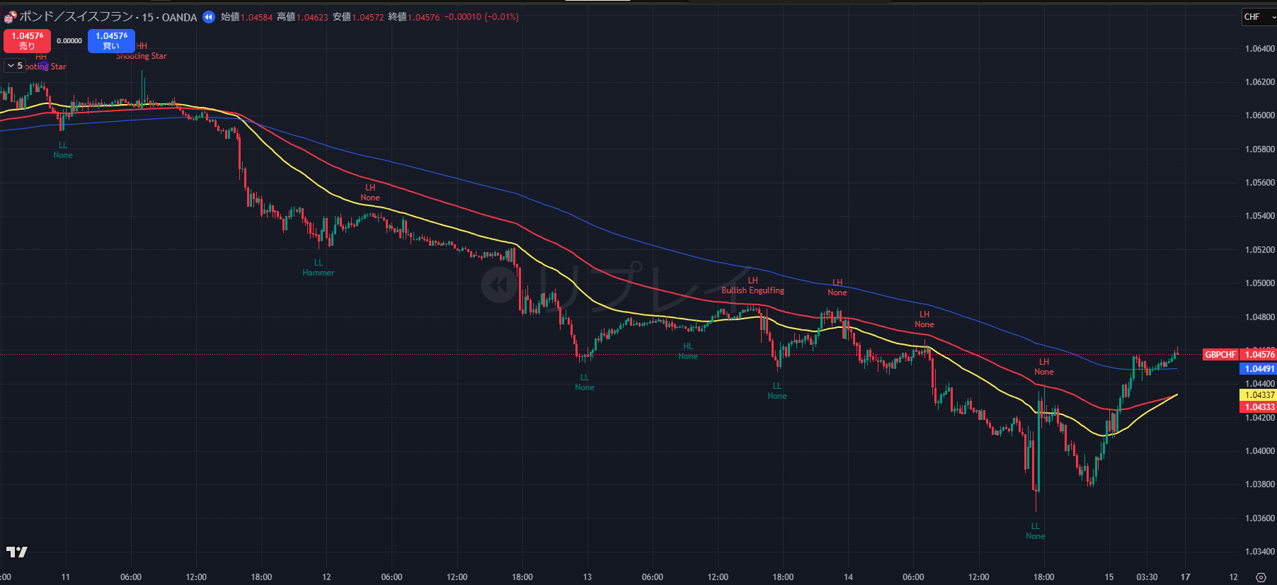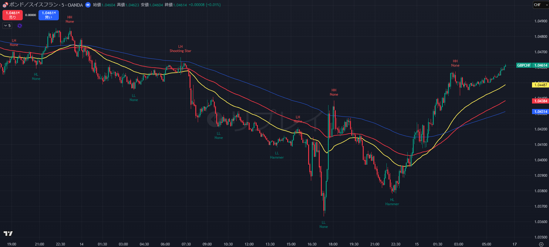 - 本日の相場全体のまとめ: GBP/CHFは4時間足レベルで下降トレンド継続中ですが、直近では下降第5波の終焉と、短期的な調整のレンジ・上昇構造にあります。中間値1.0418付近での攻防を抜け、1.0435 ~ 1.0450のレジスタンスゾーンで売り圧力が確認できるかどうかが本日の焦点です。