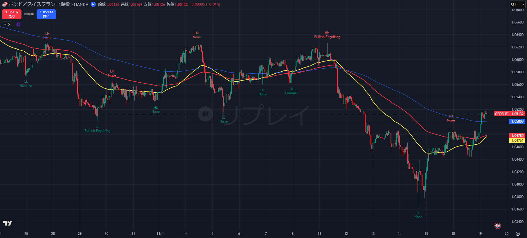 一方で、1時間足はラスト押し安値 1.0461 を守りながら高値更新の並びを作り、上昇トレンド に転換しています。4時間足の大きな波の「戻し」の動きが、1時間足では明確な上昇トレンドとして描かれている状態です。現在の価格は、1時間足のラスト押し安値 1.0461 から大きく離れており、次の押し目を待つ局面 にあります。