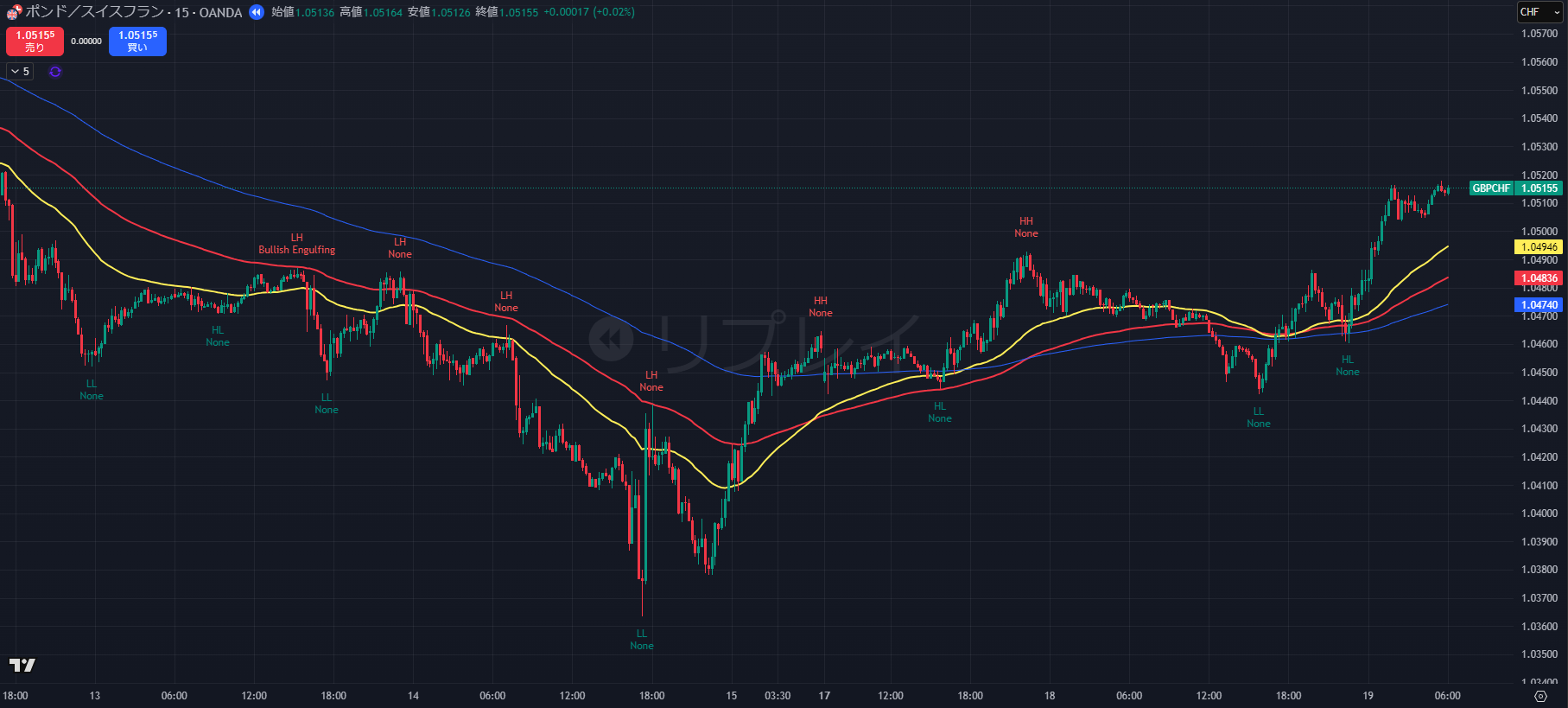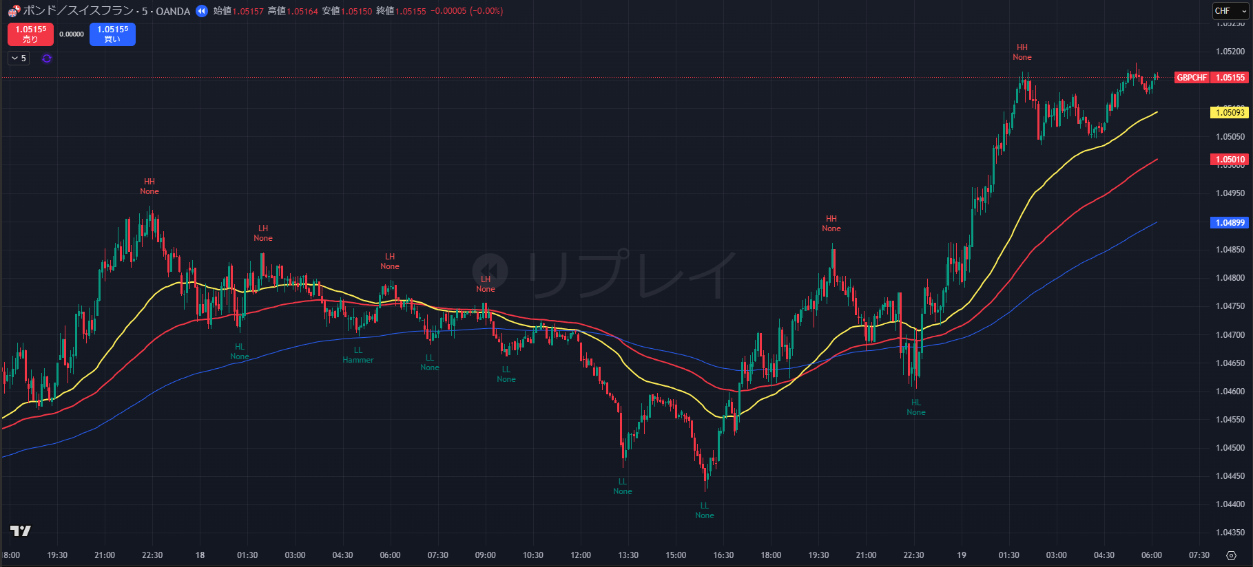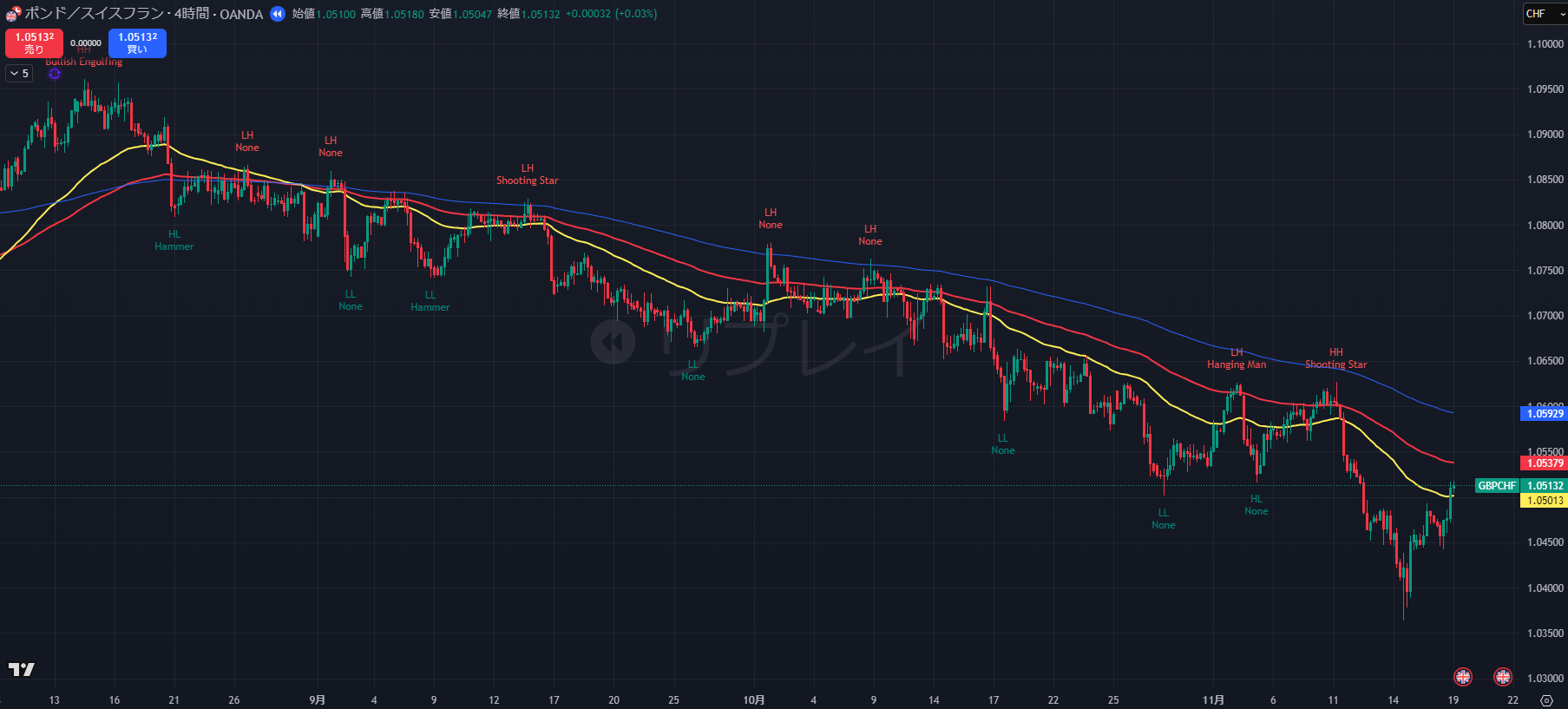- 本日の相場全体のまとめ: GBP/CHFは、4時間足で大局の下降トレンドが一時停止(ラスト戻り高値 1.0486 を上抜け)し、1時間足が上昇トレンド を形成するという、大局と短期の目線が対立 する難しい局面にあります。短期的には買い圧力が優勢ですが、1.0500のキリ番が上値抵抗となっています。