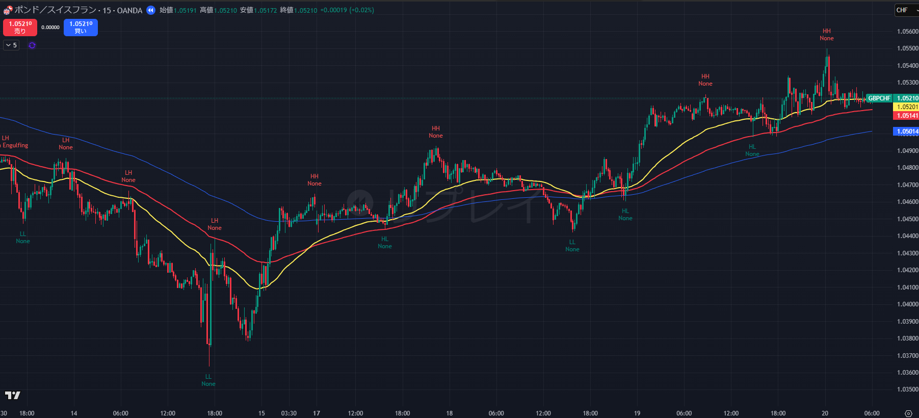 - チャートパターン: 現在、価格は高値圏(1.0520〜1.0530)で推移しており、上値が重くなるようであれば上昇フラッグやレクタングルのような調整パターンを形成する可能性があります。
