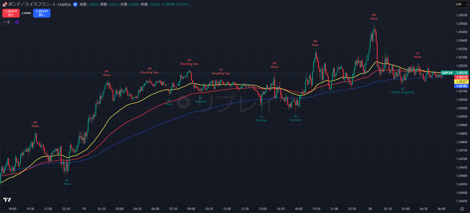 - 昨日の終盤にかけて、価格は1.0520 付近で一度調整の動きを見せましたが、再度買い戻され、強い下ヒゲを伴って引けています。