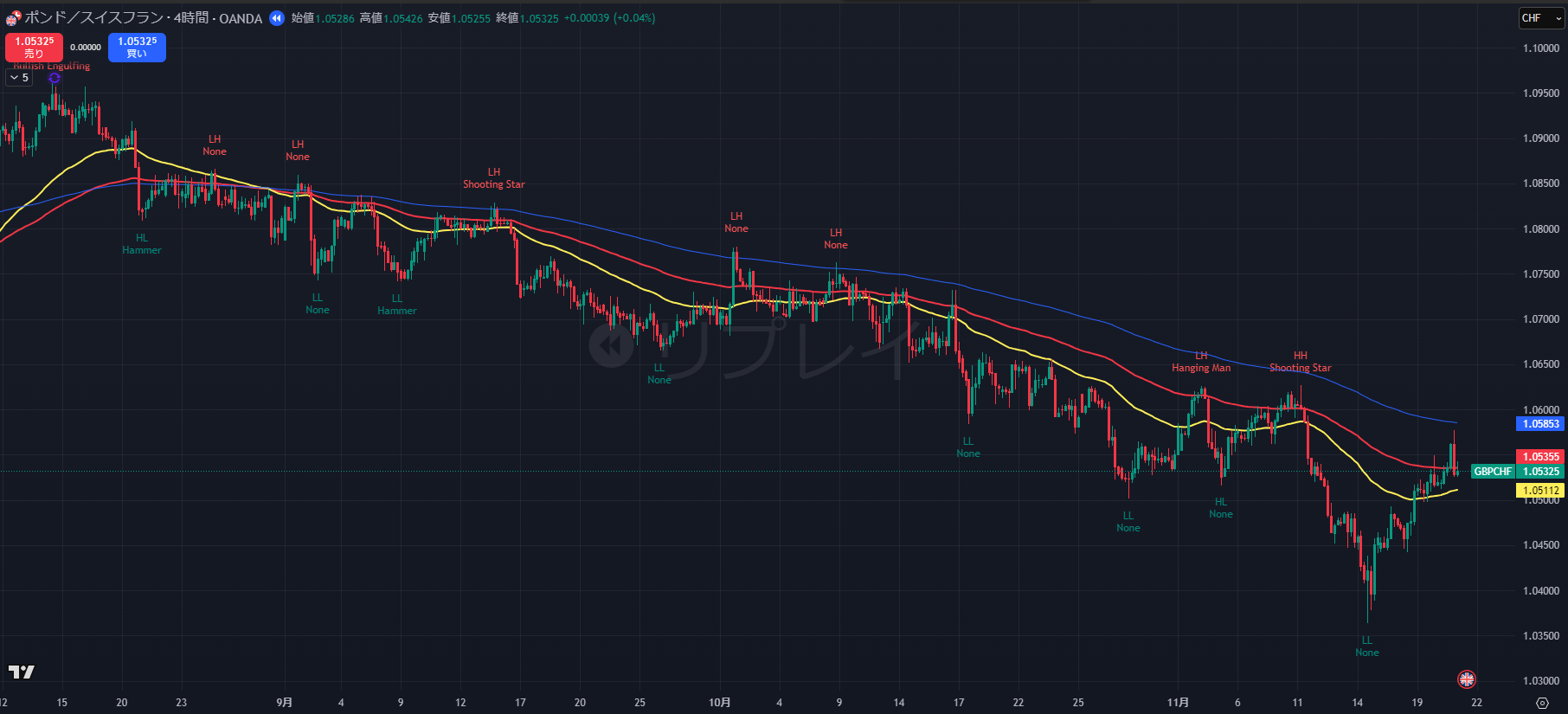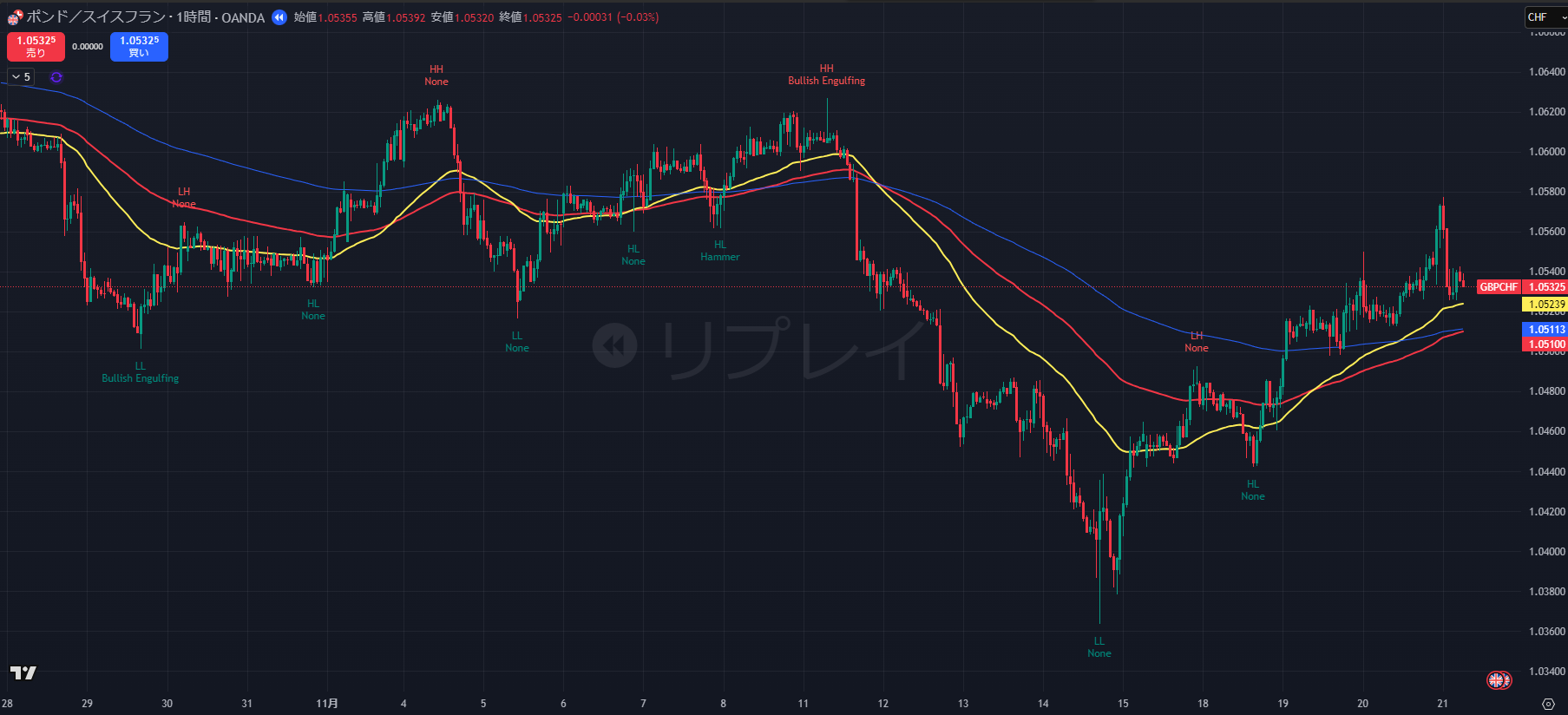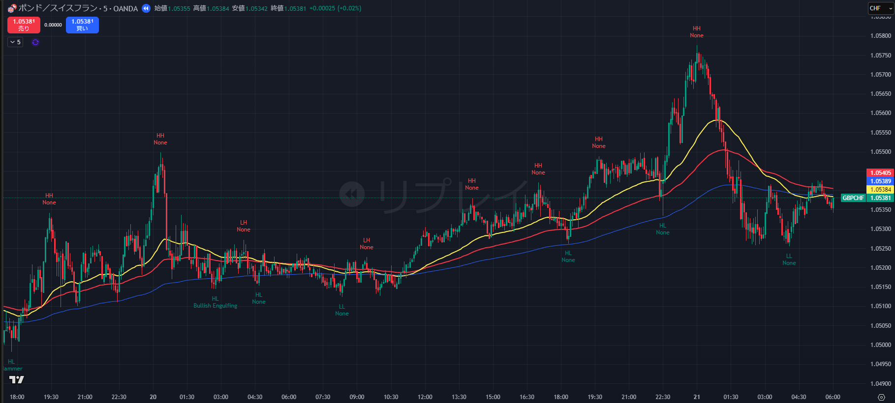 - ラスト押し安値 / 戻り高値: ラスト押し安値は 1.05193 / 戻り高値は現在の上昇トレンドにおいては存在せず。