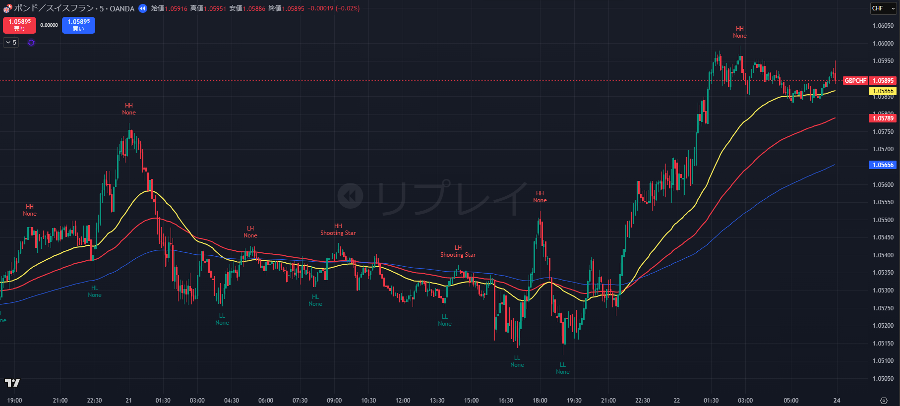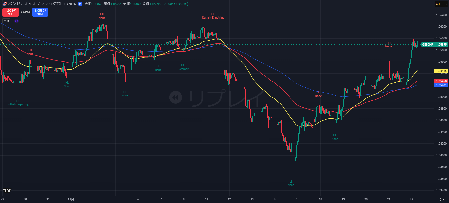 - GBP/CHFは、4時間足ラスト押し安値 1.05040 を背骨とした上昇トレンドの最中にあり、大局は買い目線です。