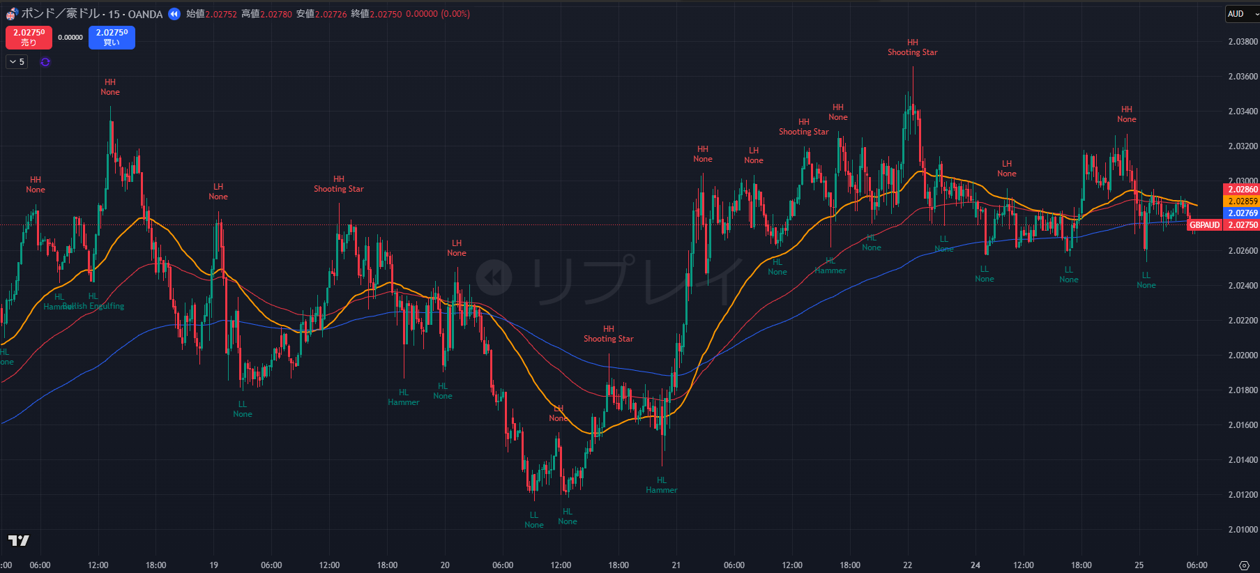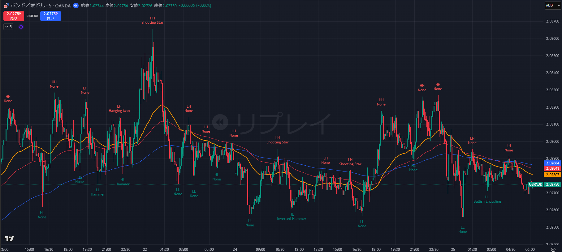 2.02950 付近でのエントリーを仮定した場合、価格は24日夜にかけて上昇し、2.03179(1H足 18:00)まで到達した後、さらに2.03230(15M足 22:30)の高値を付け、SL 2.03250 に非常に接近する動きを見せました。最終的に、翌25日のアジア時間午前3時には高値 2.03306 をつけ、SLを明確に上抜け損切りが確定しました。