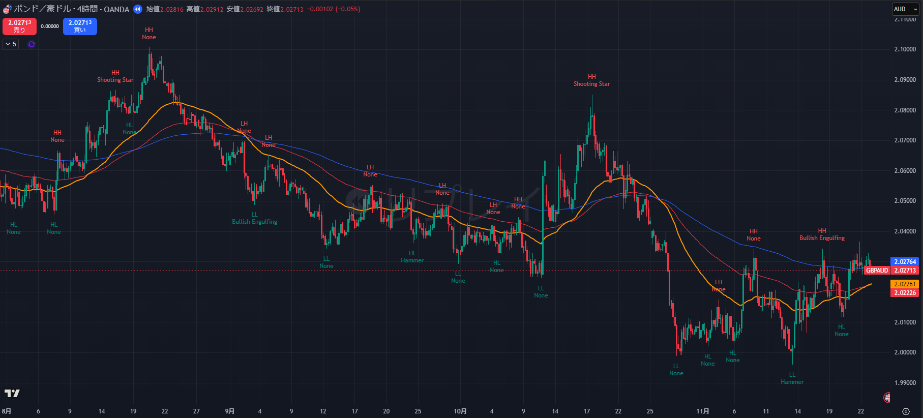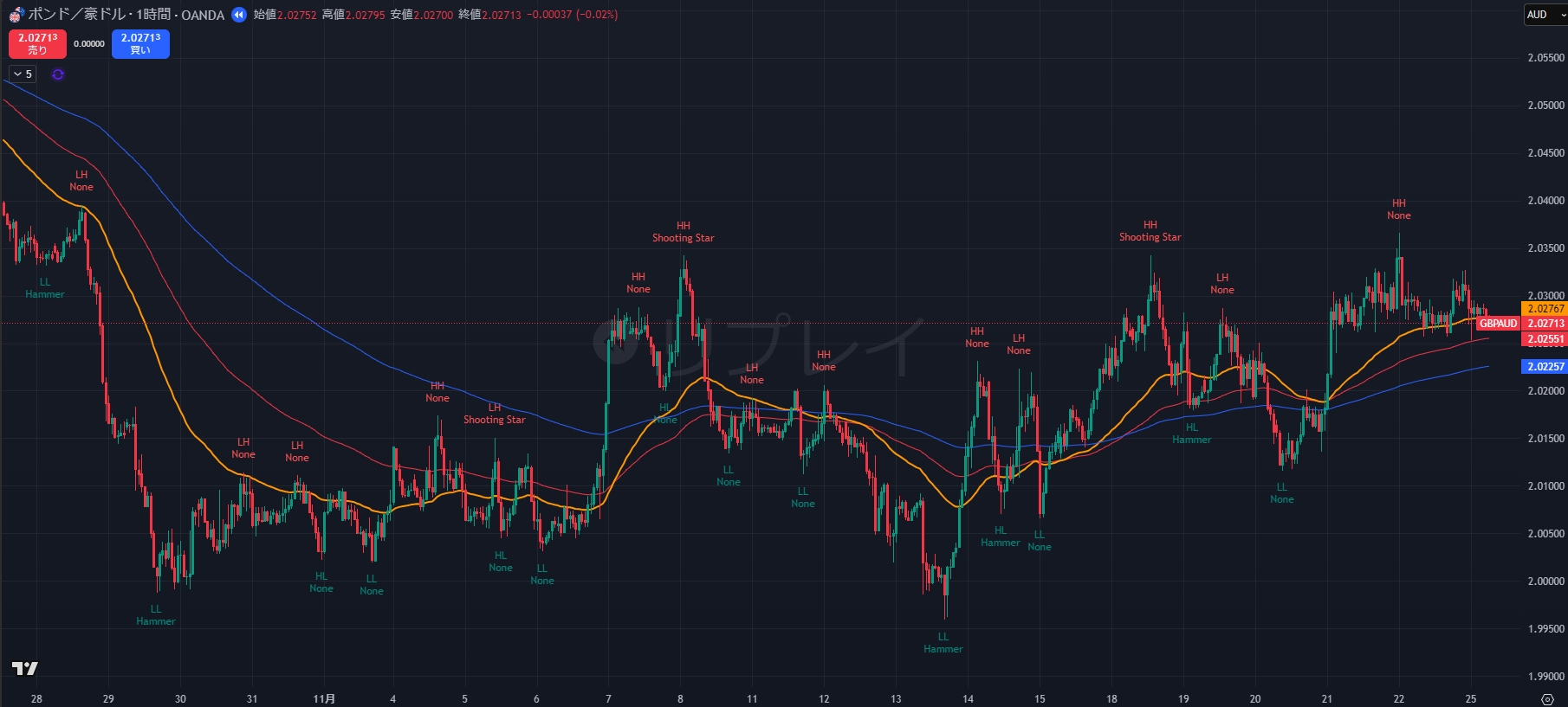 - 直近の動きは、安値 2.01567(11/20 03:00)を付けた後、高値 2.03473(11/14 11:00)と安値 2.01567 の間で推移しており、調整波の様相を呈しています。