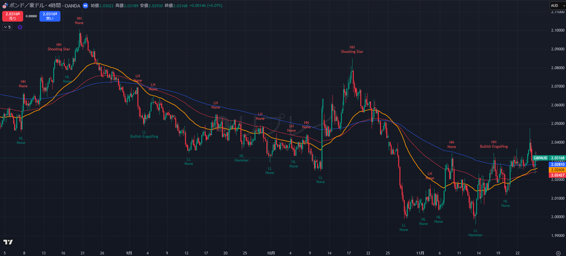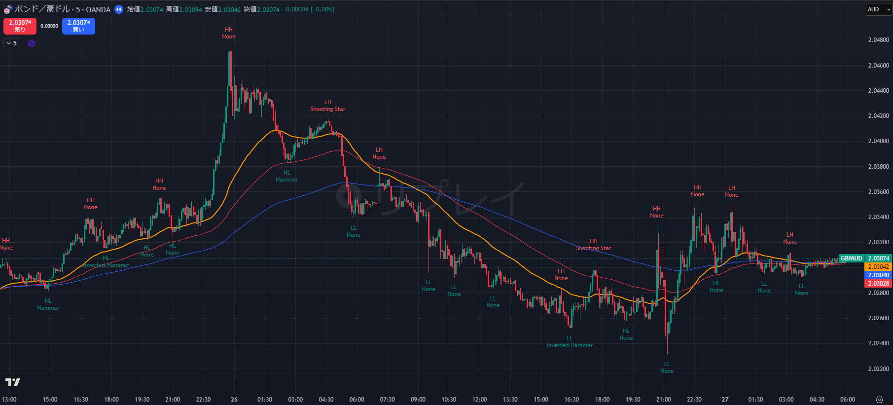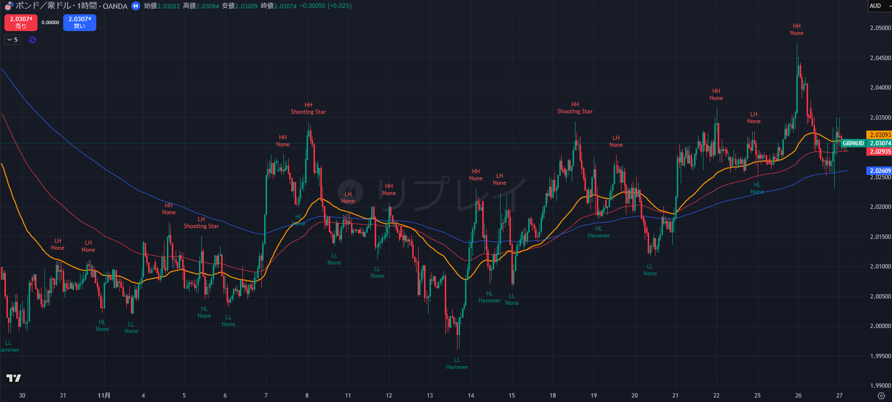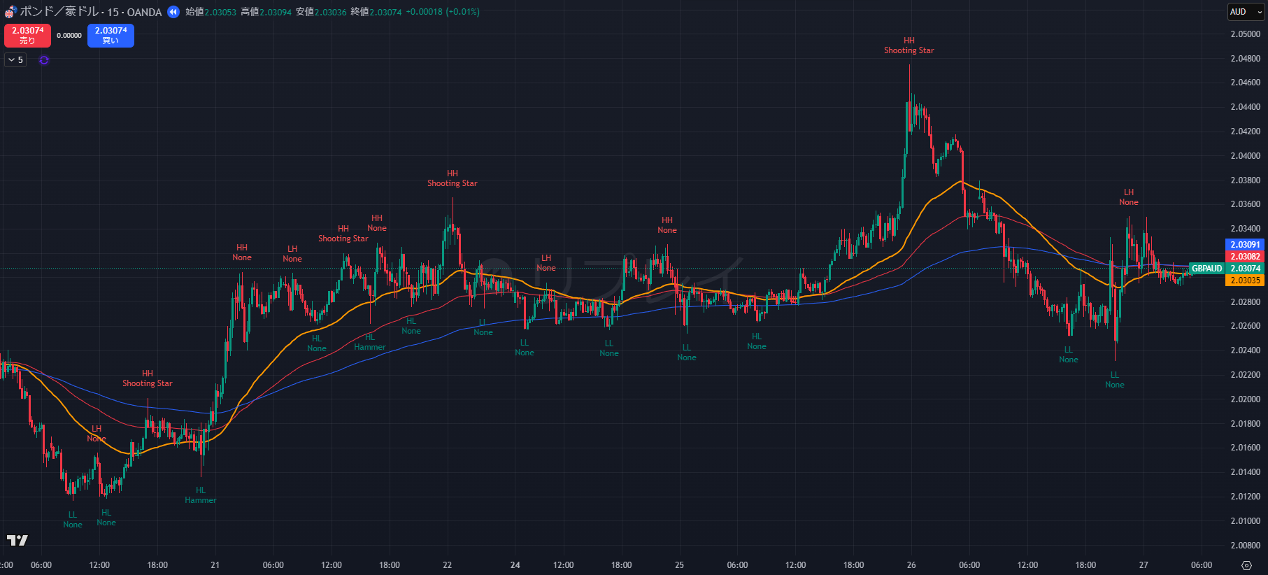 - 本日の相場全体のまとめ: GBPAUDは4時間足で 2.03078 と 2.02628 の間のレンジ相場が続いていますが、1時間足以下の短期・中期的な市場構造は下降トレンドが優勢であり、レンジ下限 2.02628 を試す動きがメインシナリオとなります。