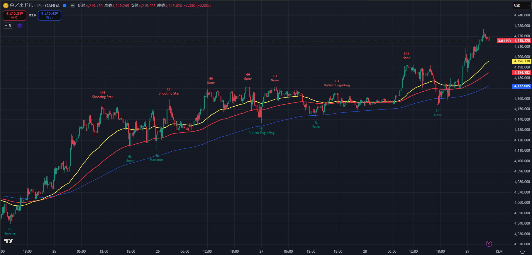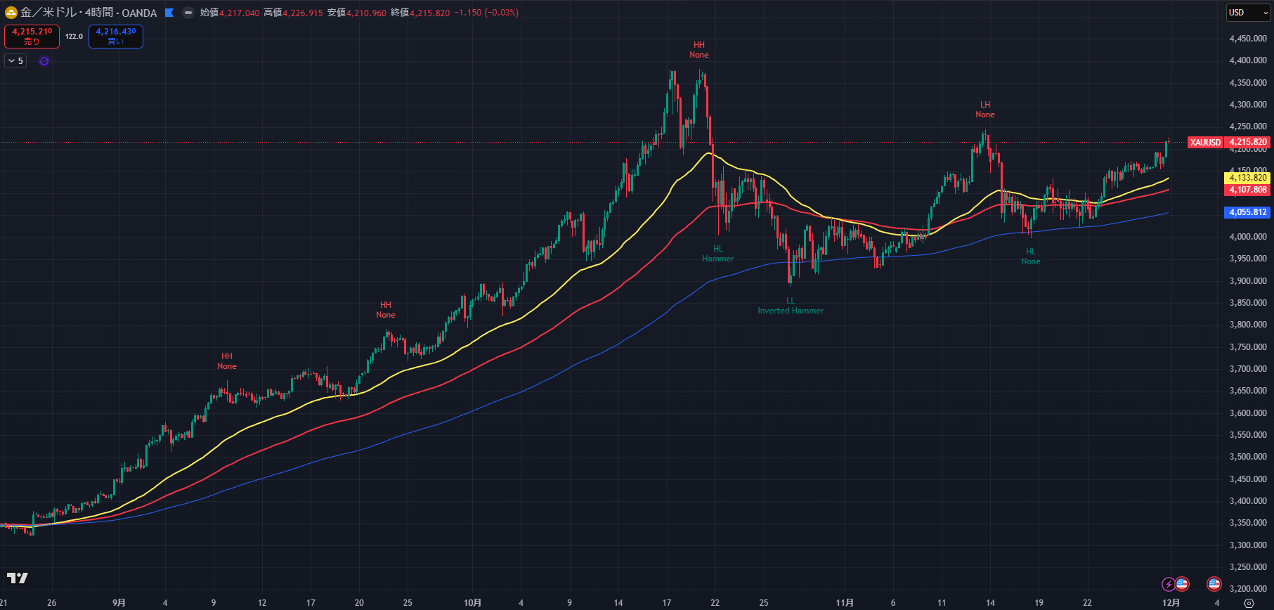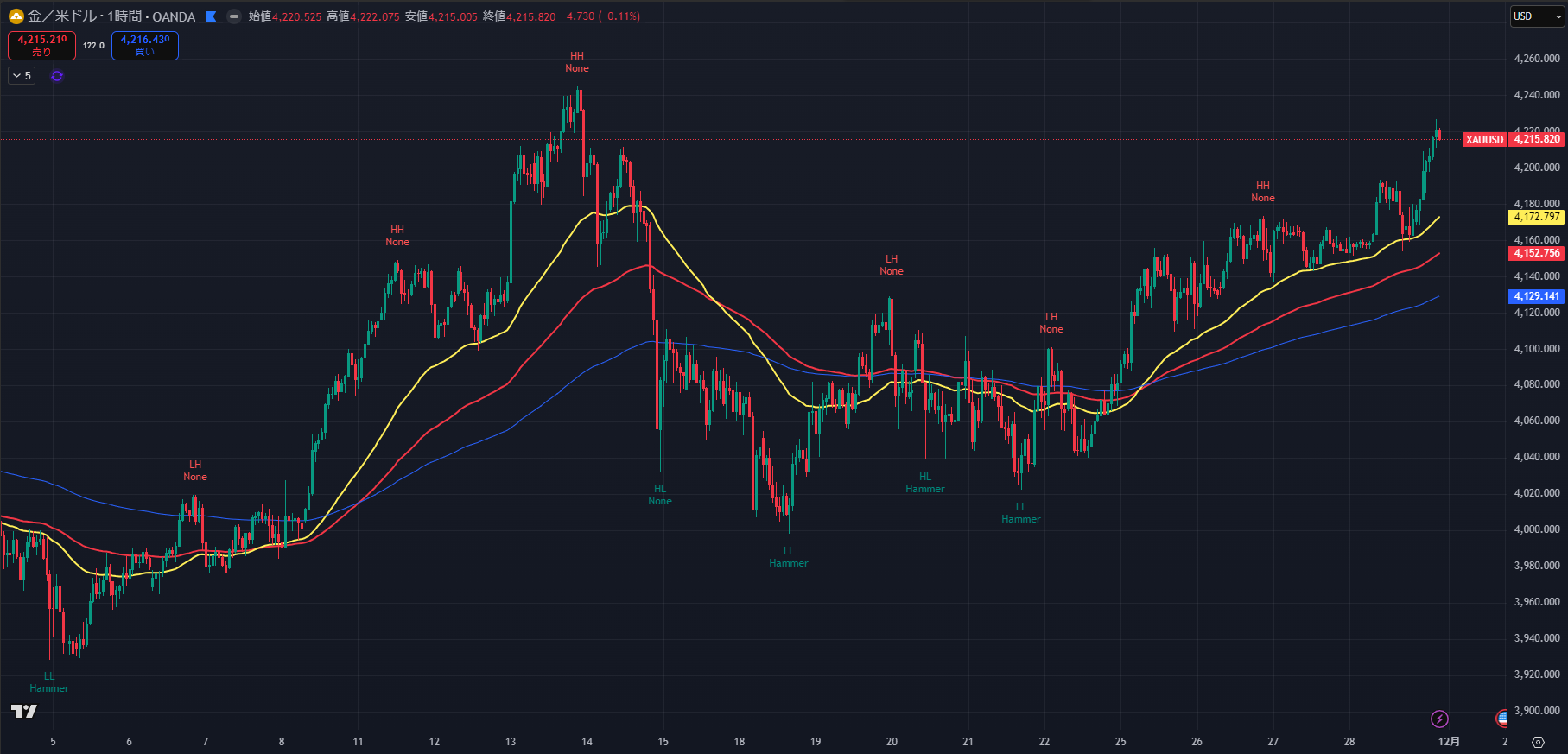- 直近の市場構造は、高値 4211.89 (2025-11-29 02:00 JST) を起点とする下落波が、直後の安値 4204.54 を守り、反発している状況です。