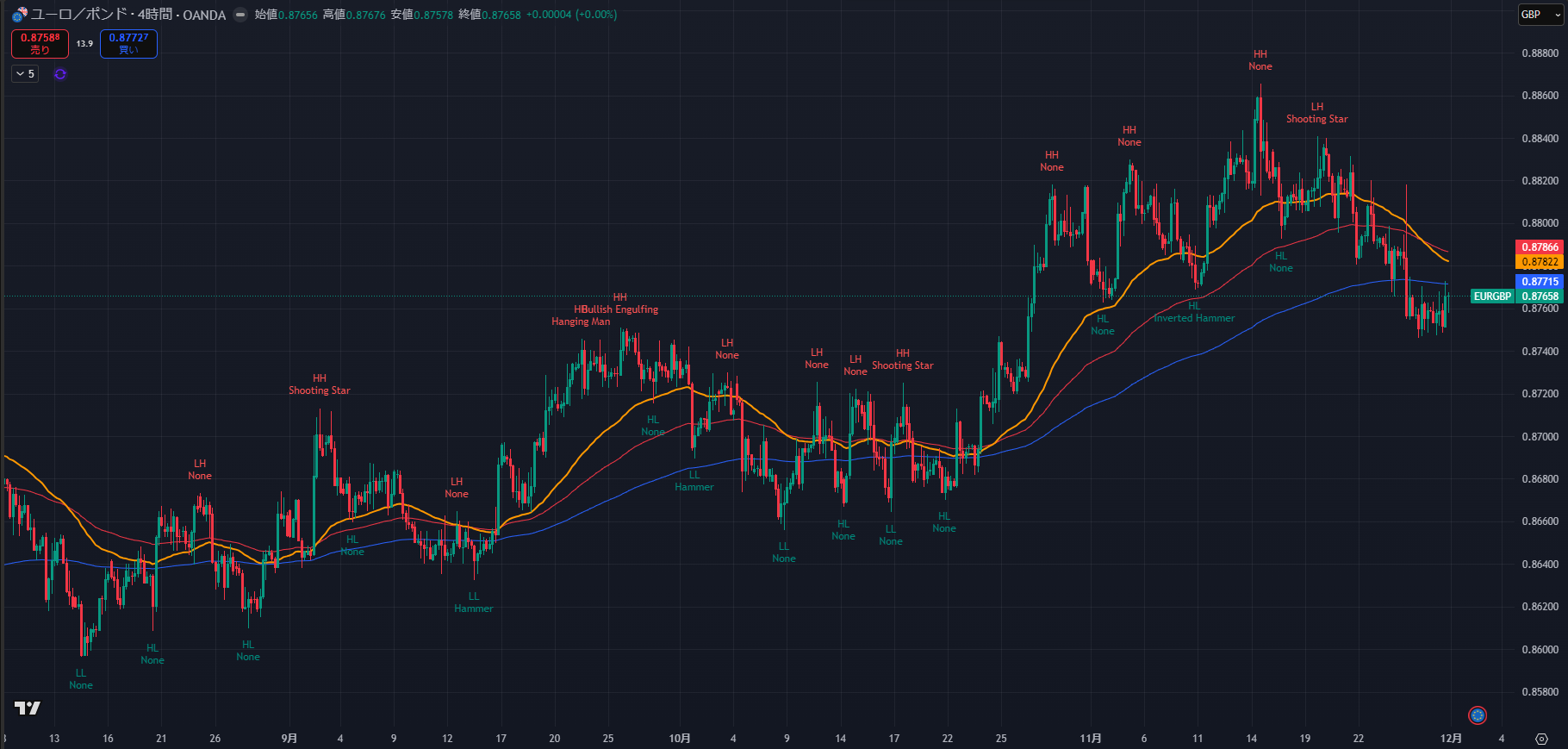 - プライスアクション: 直近では、トレンドライン理論値に近い0.87654付近で上ヒゲを頻繁につけており、0.87650〜0.8770にかけての売り圧力の強さを示唆しています。このエリアを実体で上抜けられない限り、下降トレンドへの復帰が濃厚です。