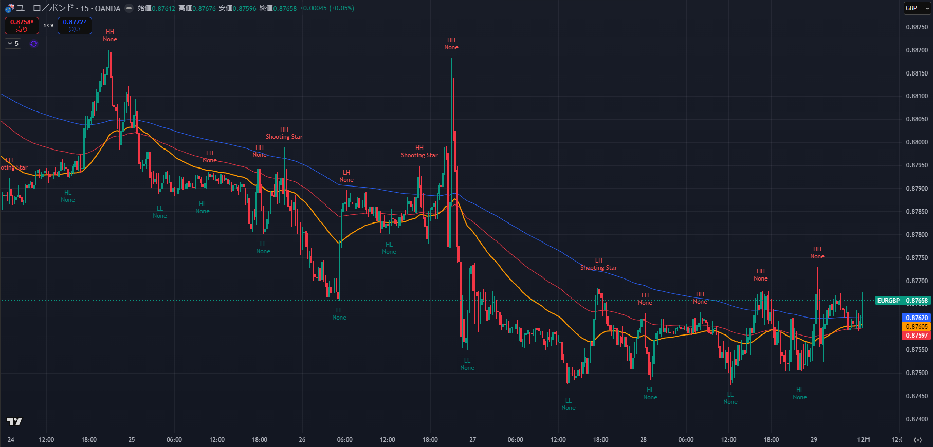 - 短期市場構造: 15分足では、直近安値0.87461から反発した後、高値を更新し短期的な上昇(HH/HL)の動きを見せています。これは1時間足の下降トレンドに対する調整の上昇波(プルバック)と捉えるのが妥当です。