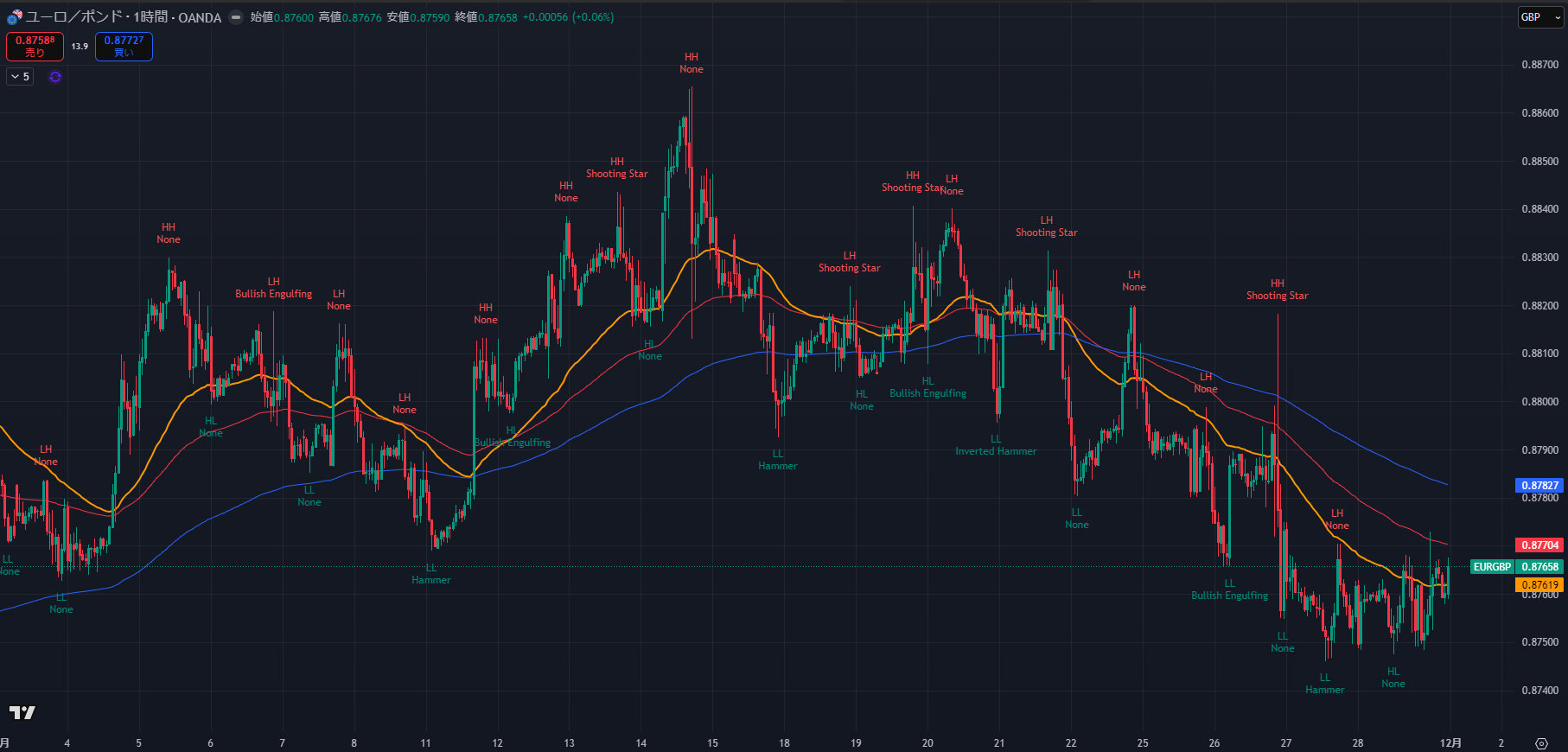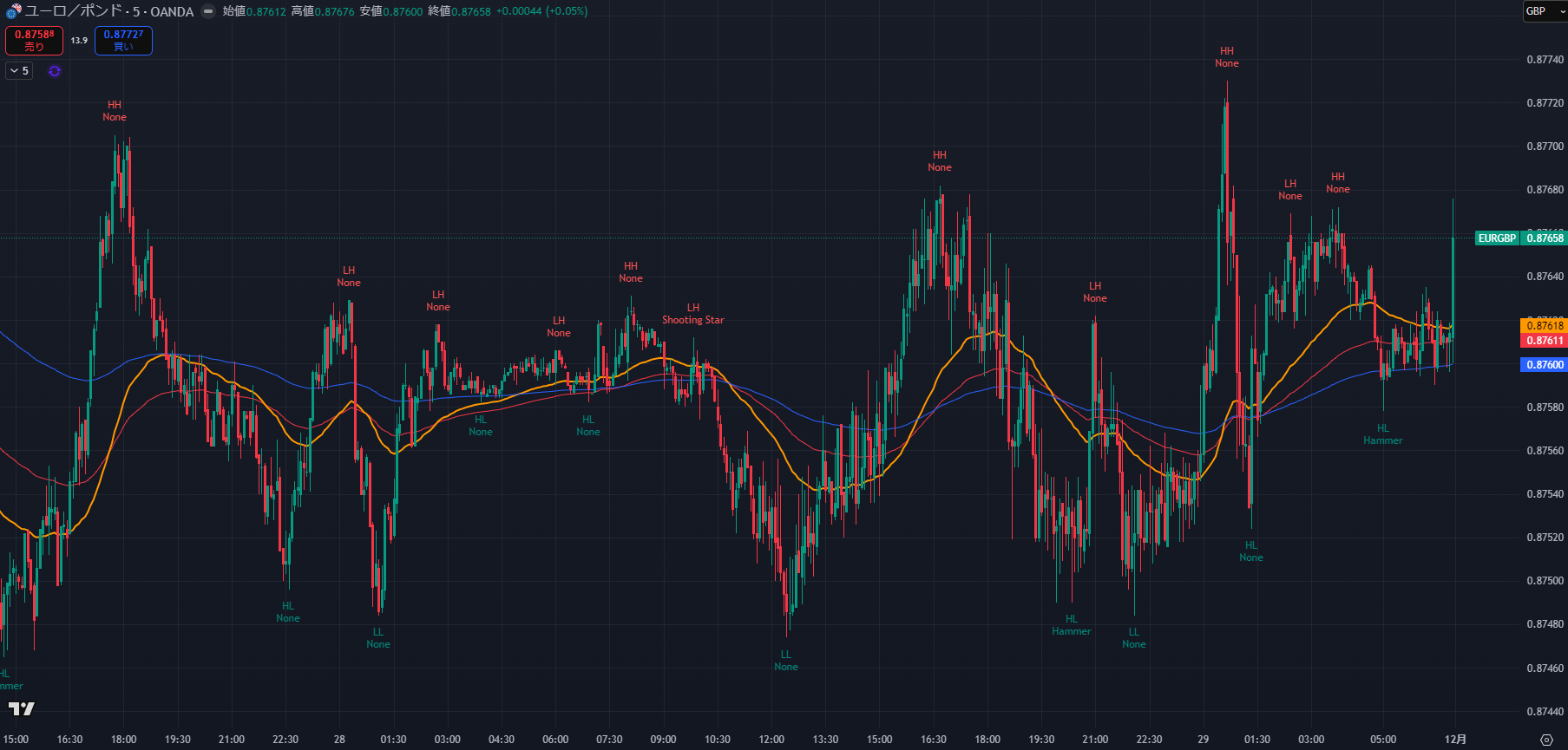 - チャートパターン: 5分足レベルでは、安値0.87461を起点に上昇した後、0.87650(1H高安の中間値)付近で揉み合っており、短期的な**三角保ち合い(Symmetric Triangle)**のような形を形成しつつあります。