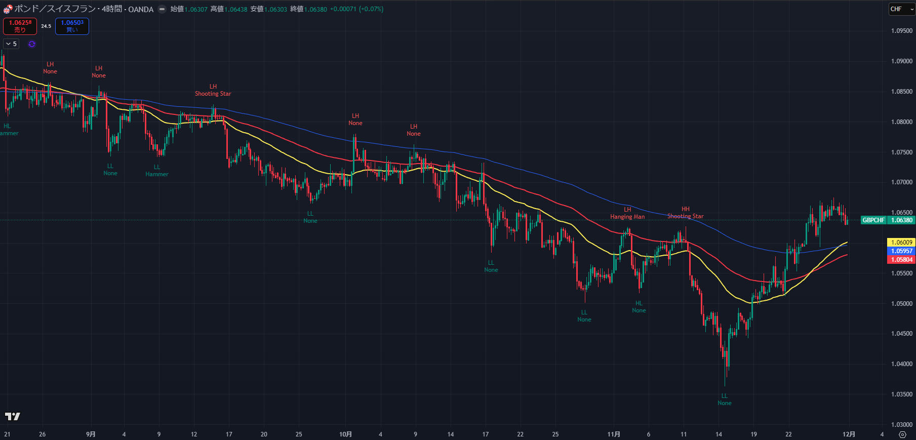 - 本日のGBP/CHF相場は、4時間足で高値 1.06734 と安値 1.05814 のレンジ相場が継続しています。
