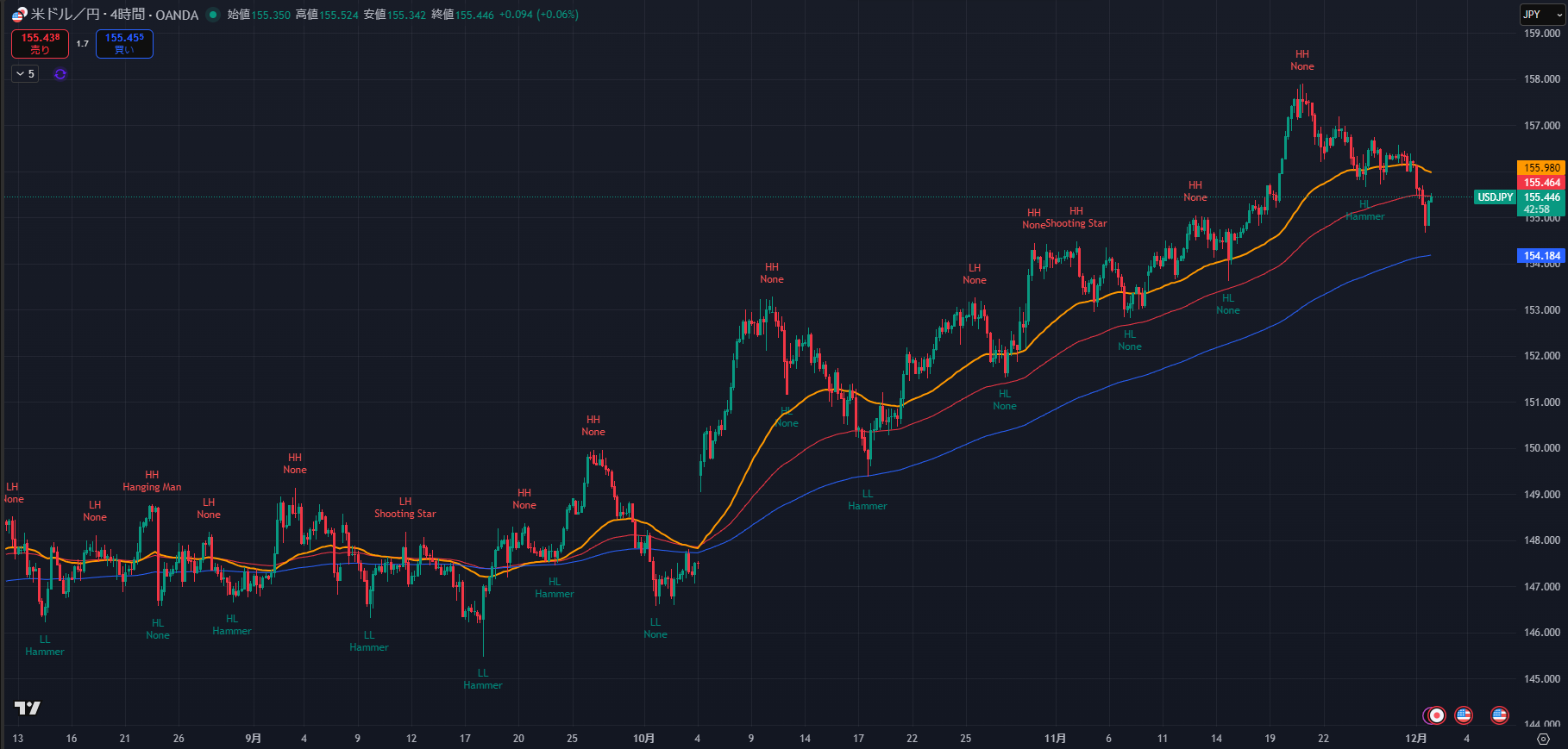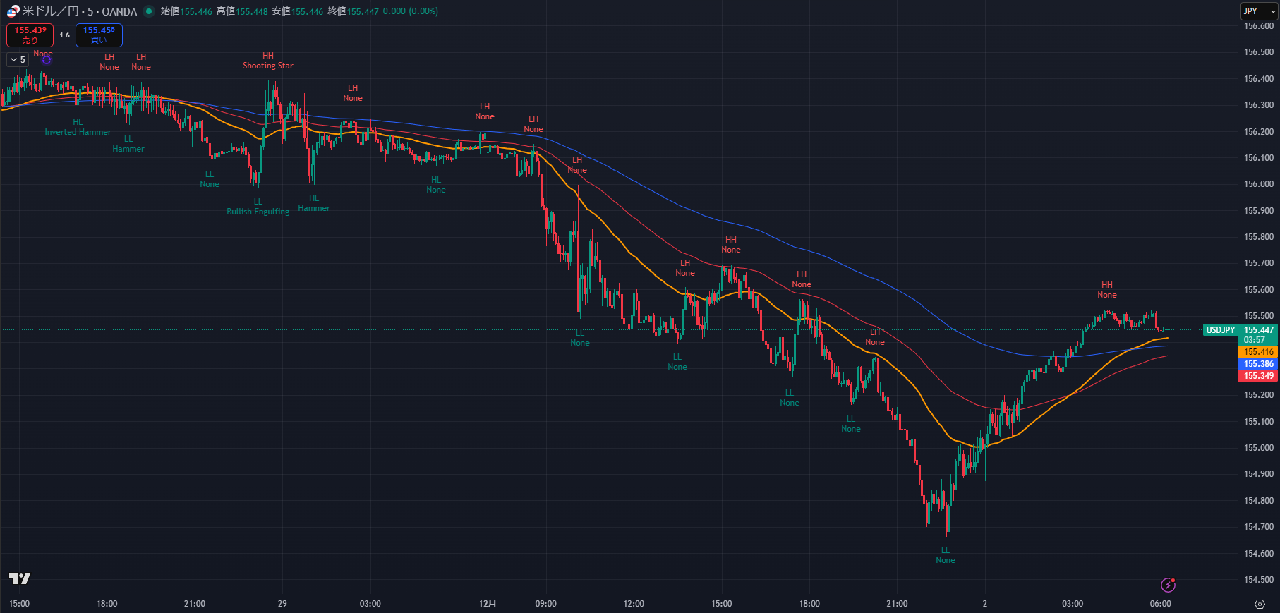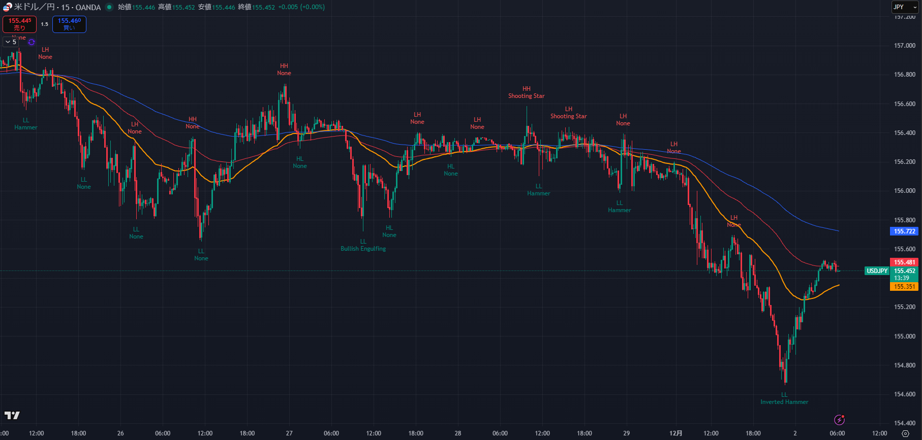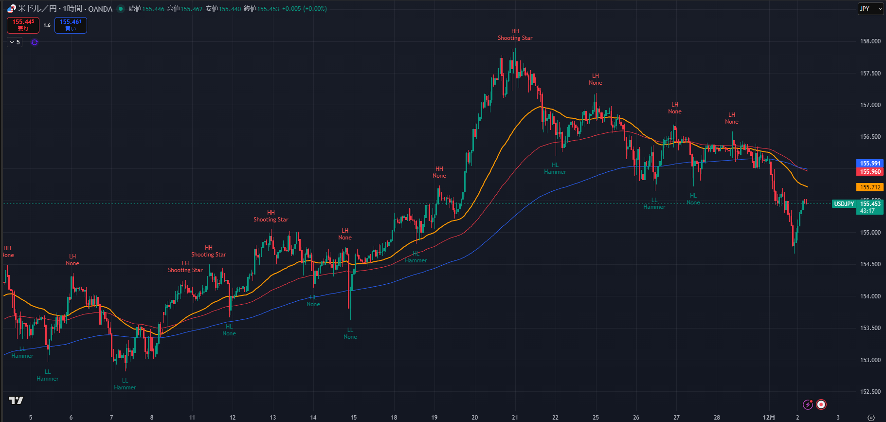 - 検証詳細: 昨日の価格アクションは朝方の高値 155.93 をピークに下落を開始しました。 ダウ理論上の「戻り高値」を作る動きを想定していましたが、日銀のタカ派発言観測(12月利上げの可能性)による円買い圧力が予想以上に強く、エントリーゾーン(156.38)に到達する前に Lower High (LH) を切り下げて下落しました。 結果として指値には届きませんでしたが、「安易なロングを避け、ショート目線を固定した」 という点では、市場構造(Market Structure)の読みに狂いはありませんでした。