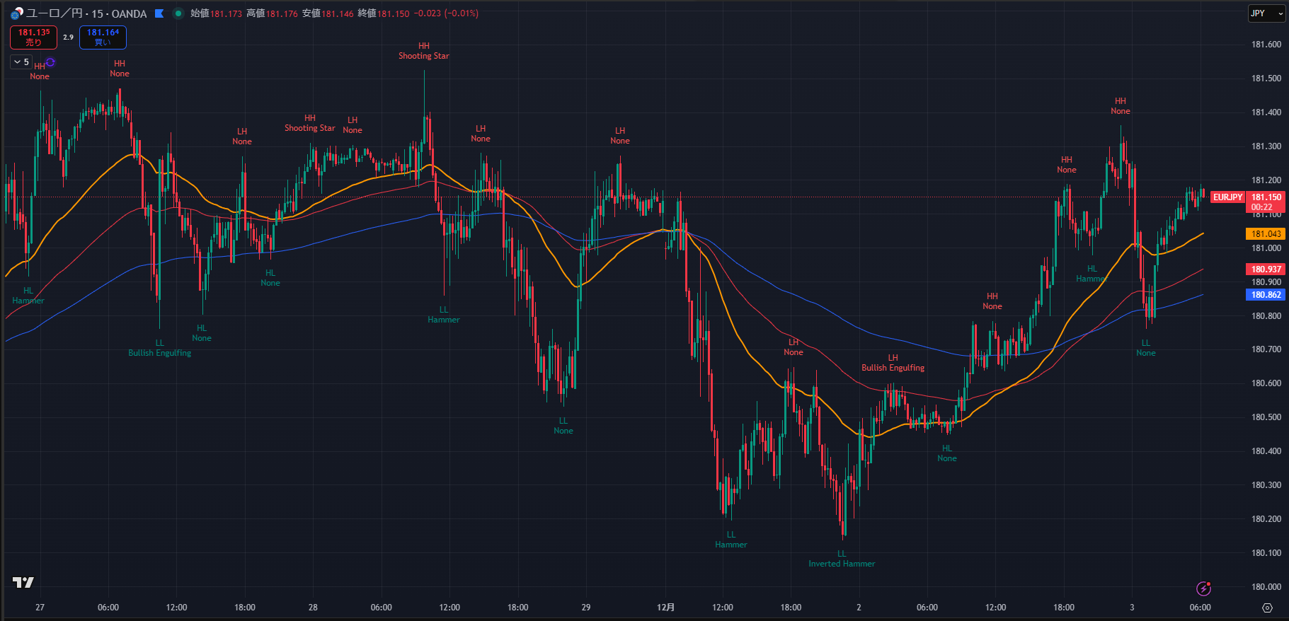 - 15分足では、181.00 の心理的節目をブレイクした後、高値圏での保ち合い(フラッグ形成)を見せています。