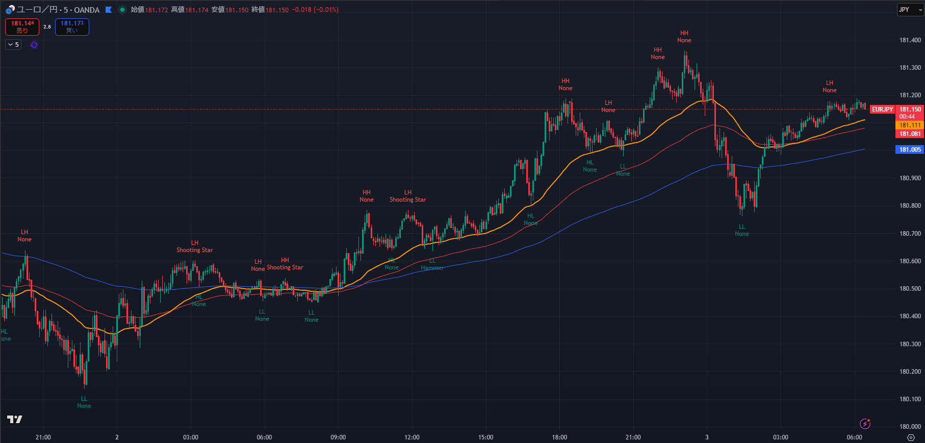 - 価格が 181.00 付近まで下落してきた際、5分足チャートを注視。