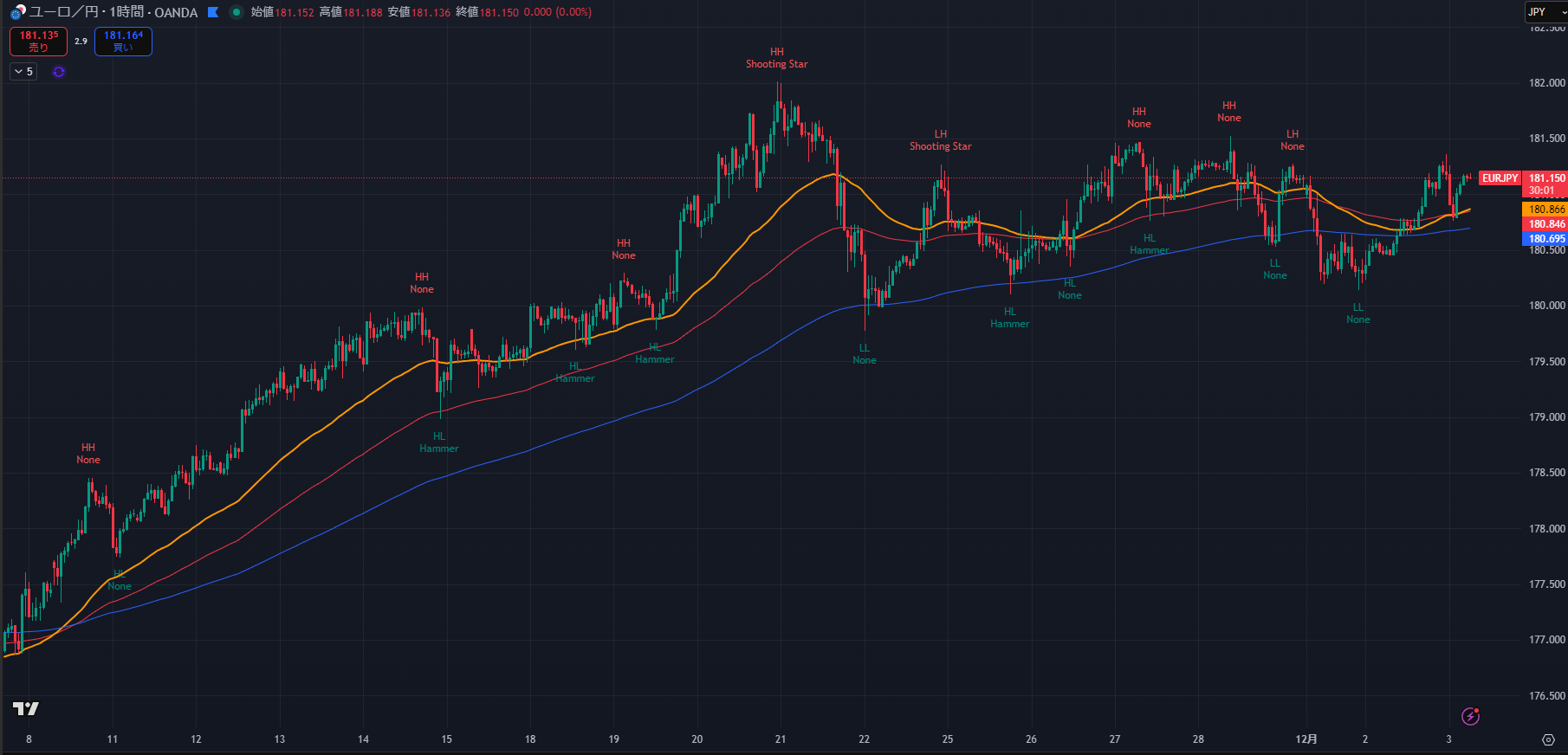 - 敗因の分析: 昨日は「日銀・植田総裁のタカ派発言(12/1)」による急落後、市場はそれを一時的な調整と捉え、V字回復(全戻し) の動きを見せました。 ダウ理論上、1時間足レベルで ラスト戻り高値 (181.00付近) を明確に実体で上抜けた時点で、「下降トレンドの終了」を認定し、ショート目線を即座に撤回すべき局面でした。 特に、180.75 エントリー後、5分足での「否定の形(陰線包み足)」が出現せず、安値を切り上げながら 181.00 をブレイクアウトしたため、市場構造(Market Structure)は「強気(Bullish)」へ転換 しています。