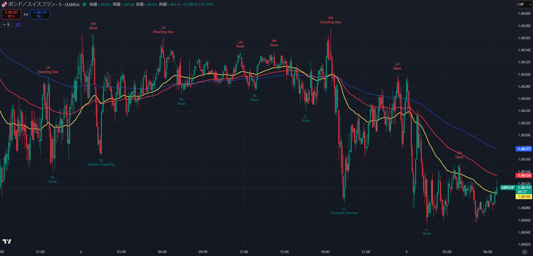 - 価格が1.0620付近まで戻した際、5分足で「長い上ヒゲ」や「陰線の包み足」が出現したらエントリー。