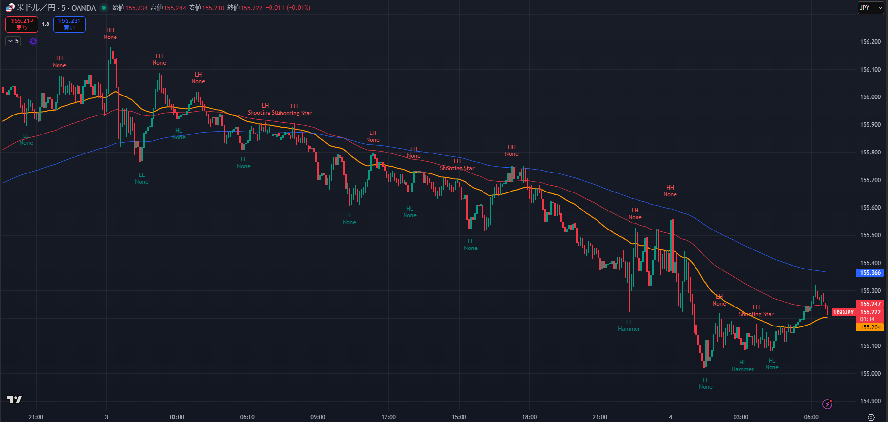 - 狙い: 1時間足の下降トレンド継続狙い。155.00円のブレイク、またはブレイク後の走りを期待。