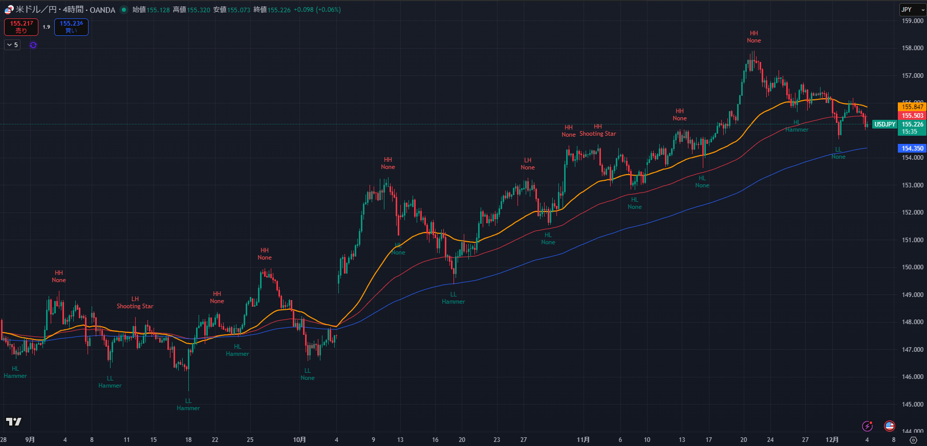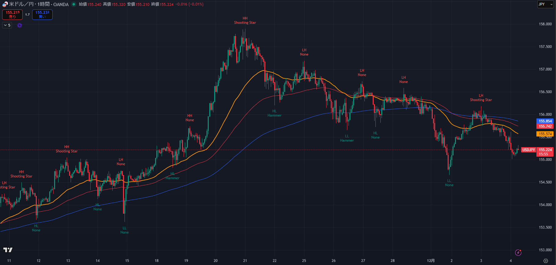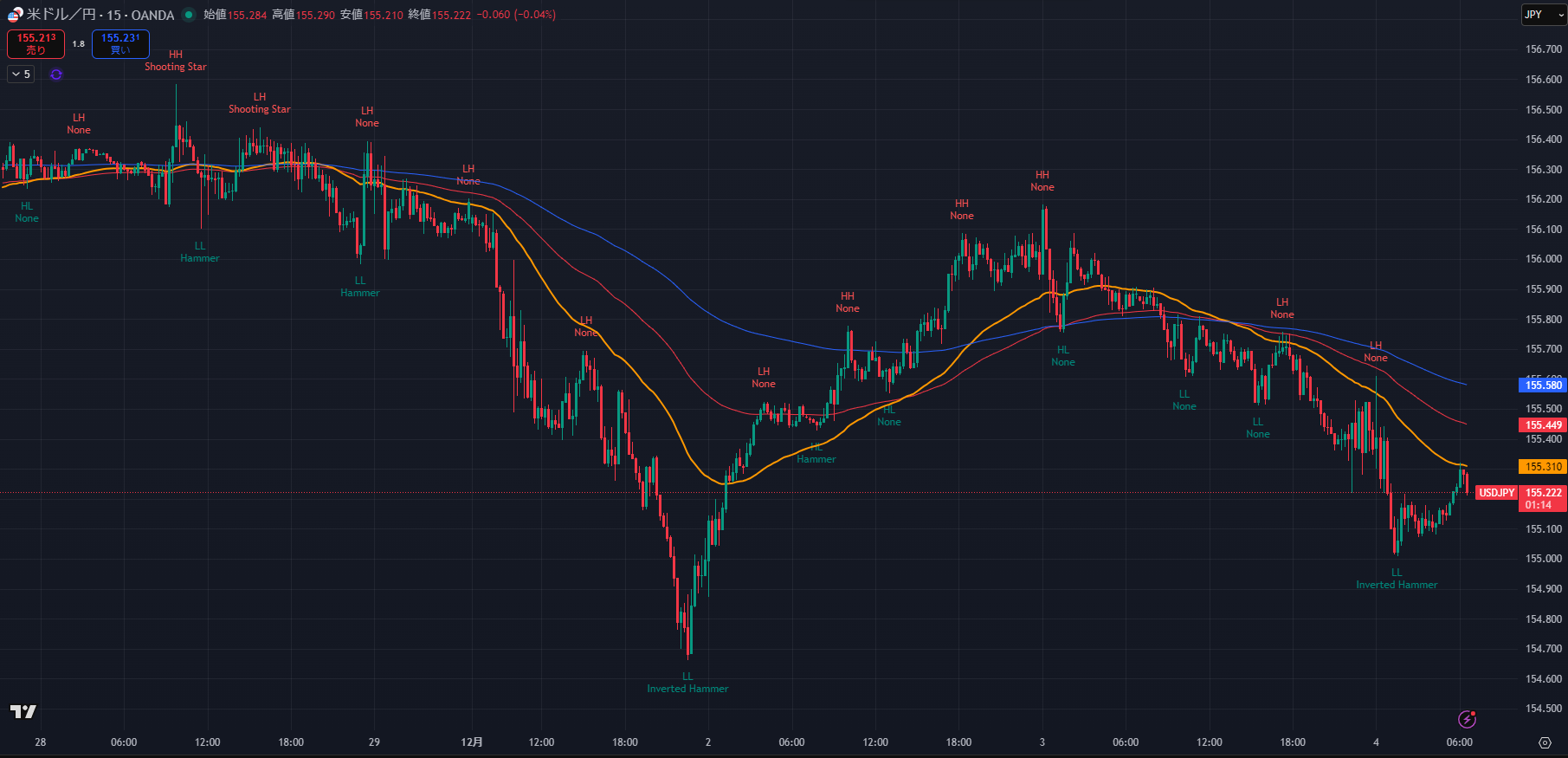 - Major Swing Low (直近安値): 155.058 (12/3 16:50)