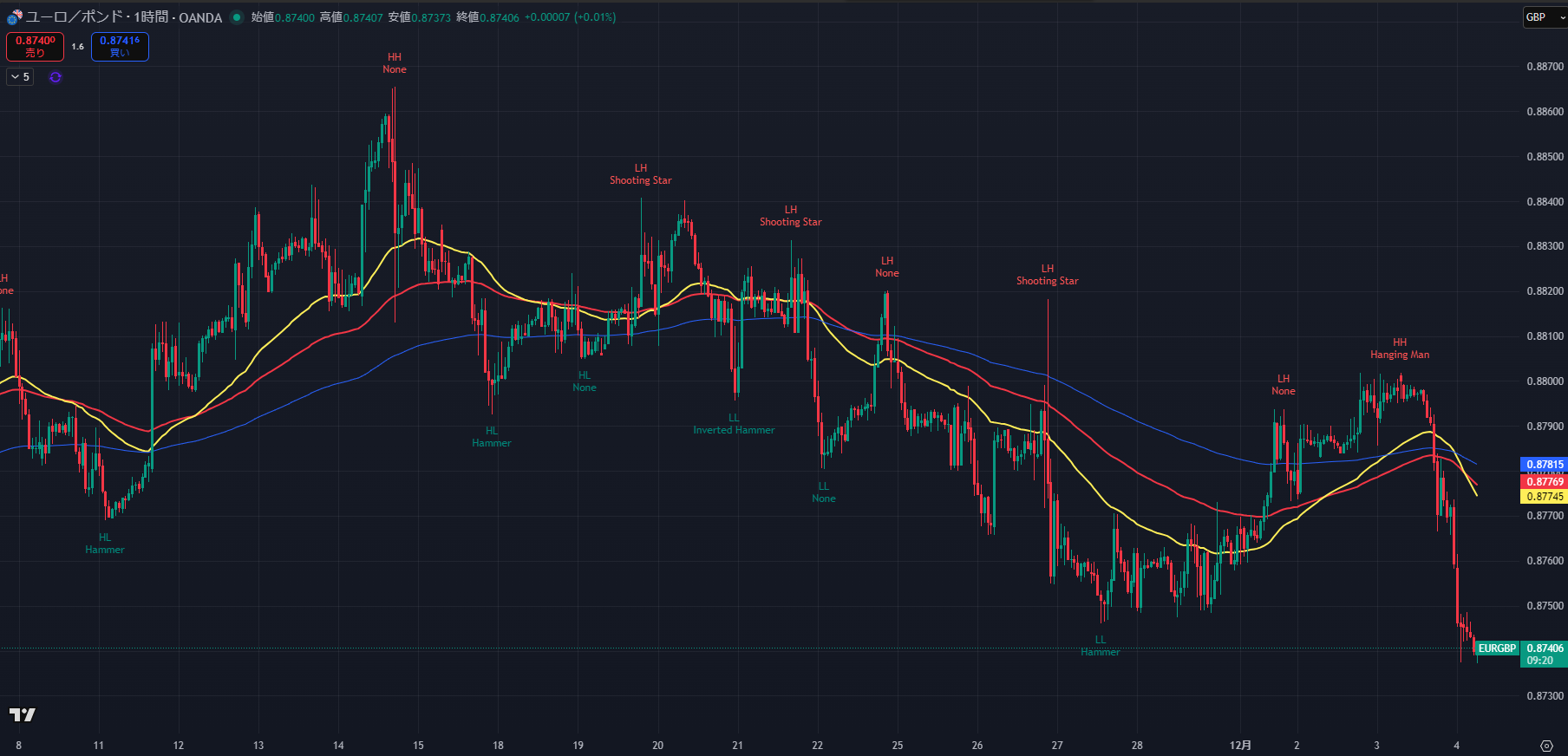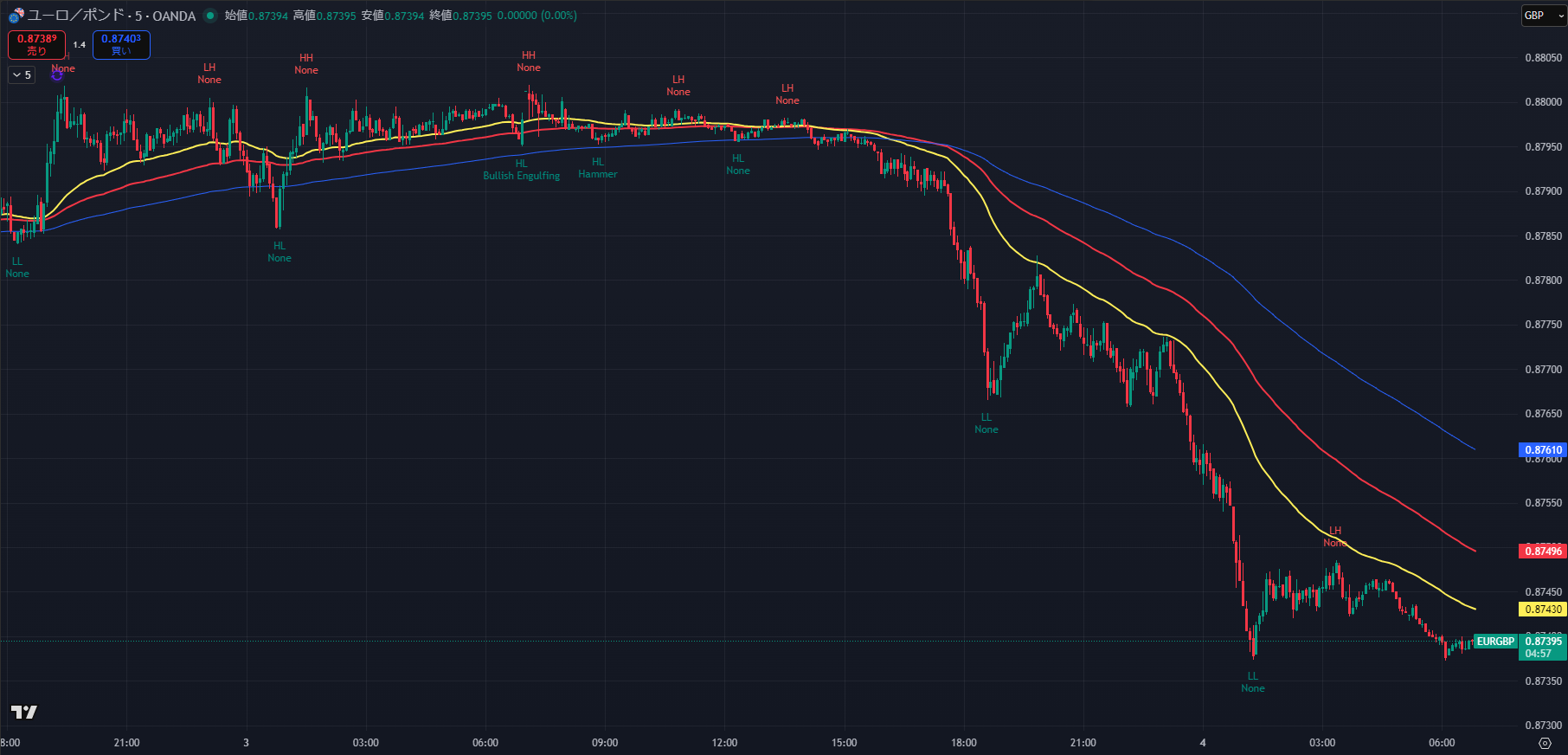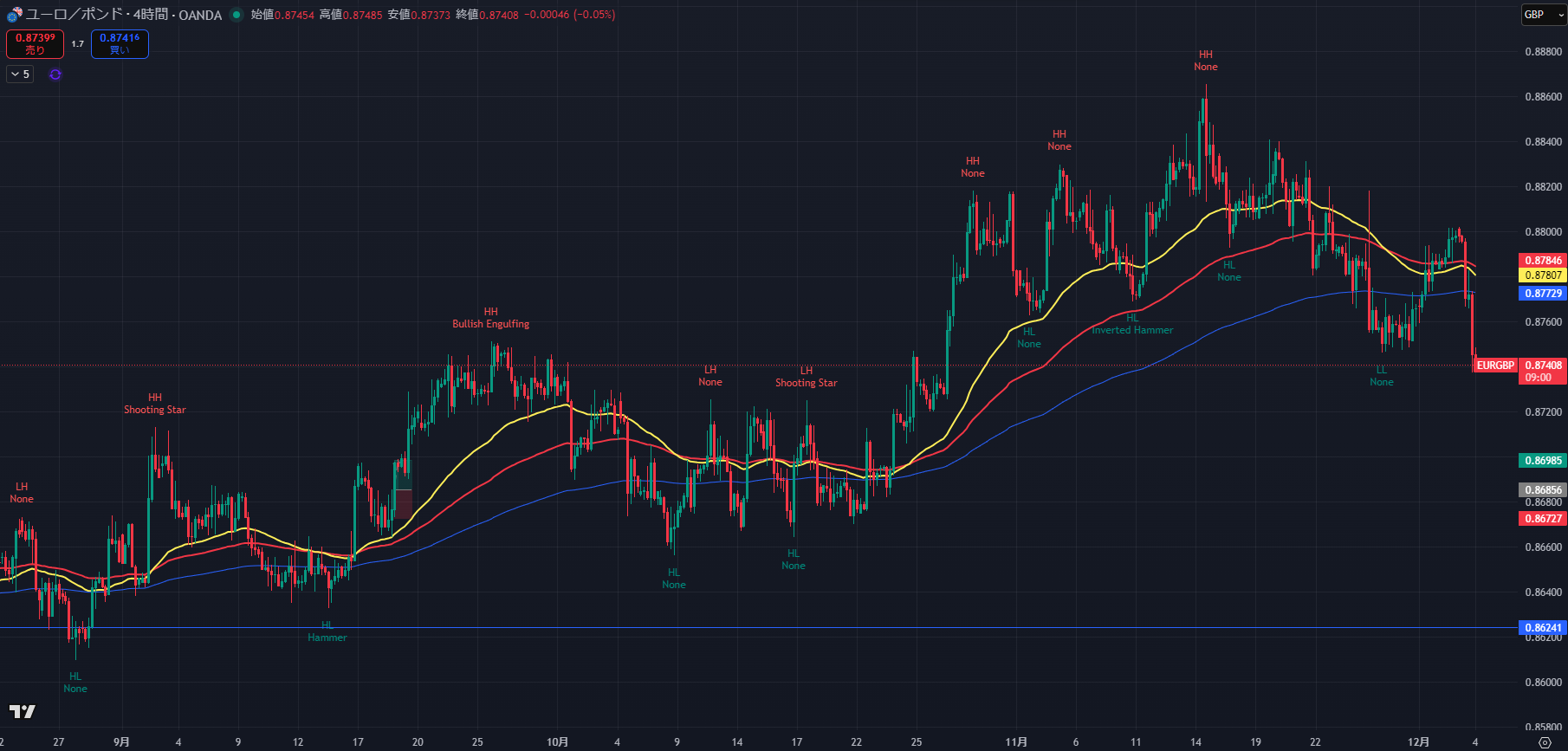 - 0.8740付近で下げ止まり、小さなレンジ(調整)を作る動きが見られます。ここから安値をブレイクすれば、トレンド継続のサインです。
