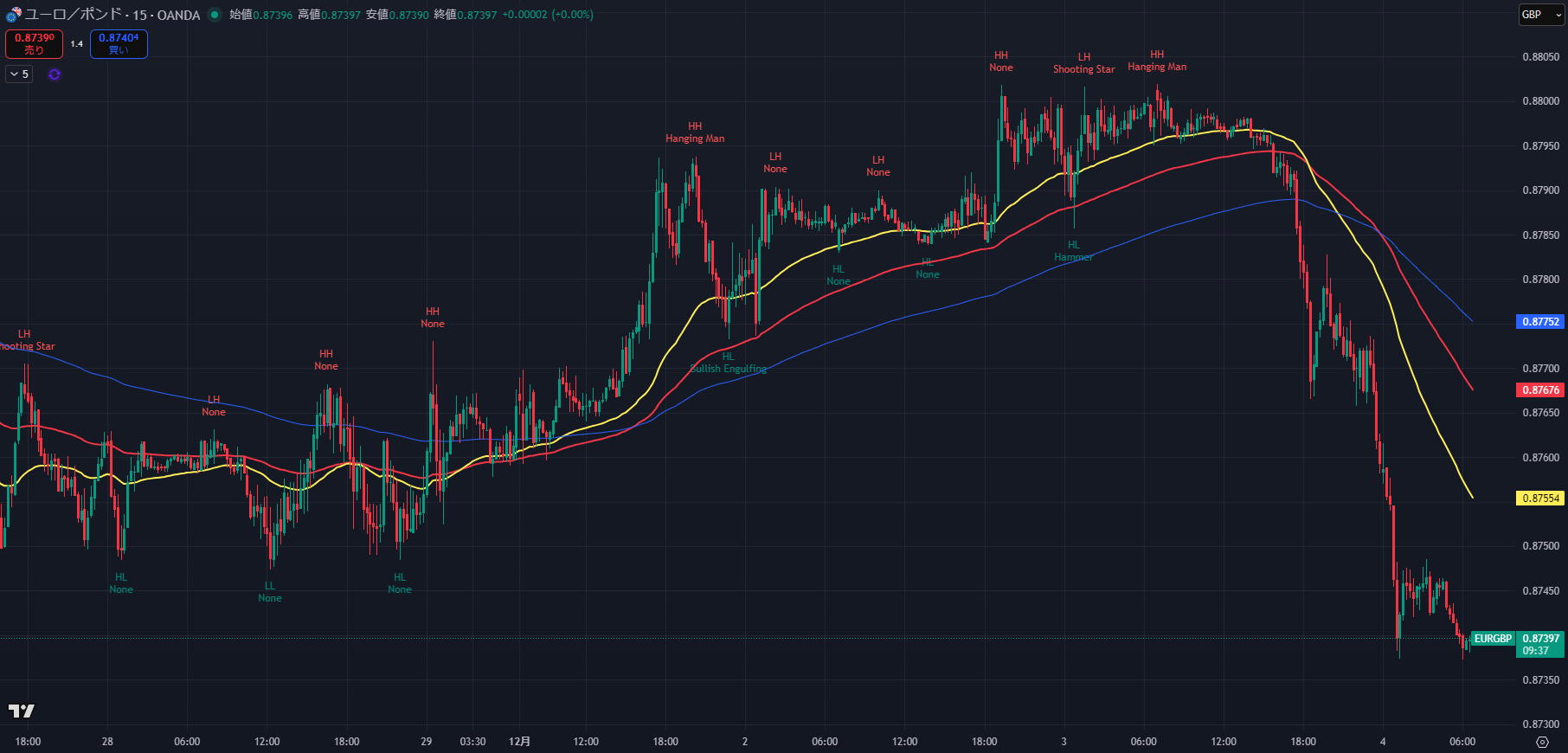 - 0.8780のサポートラインが崩壊した時点で、目線を「フラット」または「ショート」に切り替えるべき局面でした。