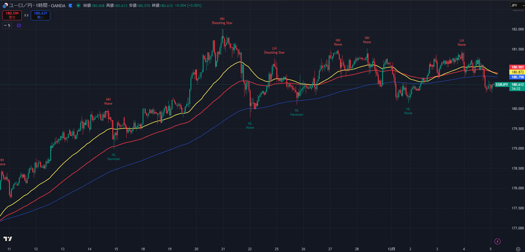 - 価格が 180.75 付近まで上昇。
