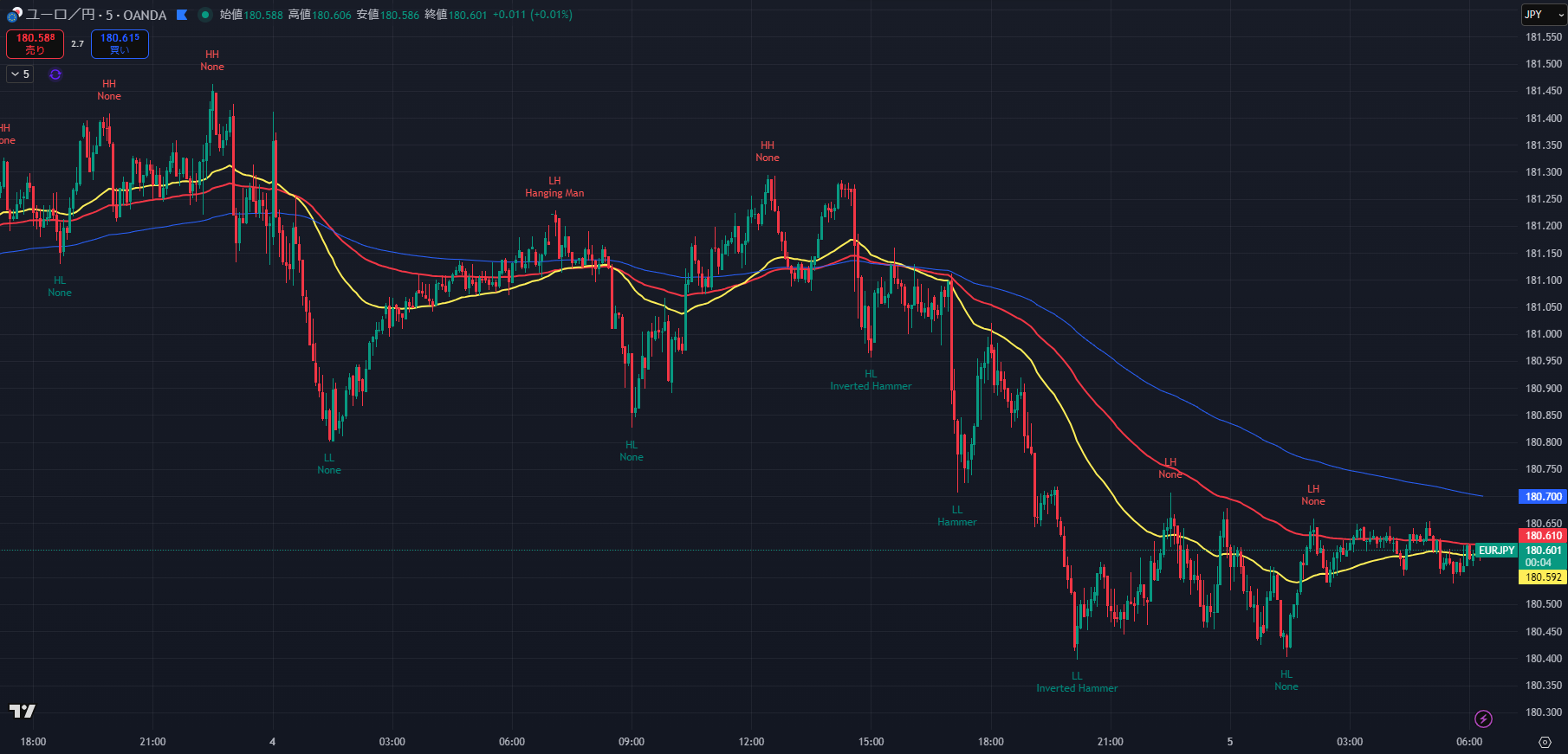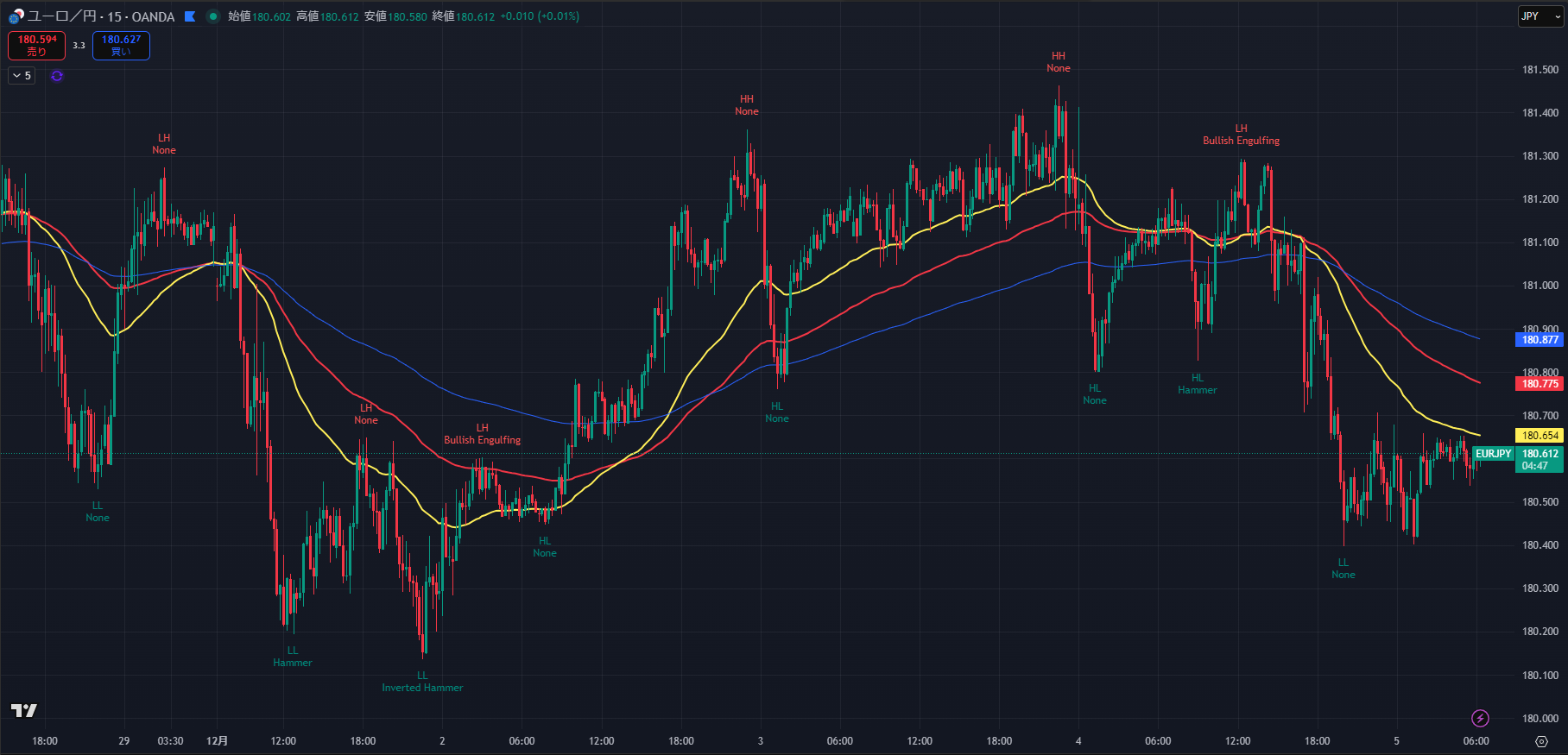 - 勝敗を分けたポイント: ダウ理論における「短期トレンド転換点(180.89)」を背に、目線を素早くショートに切り替えられたかが鍵でした。181.00割れで市場構造(Market Structure)が「上昇→下降」へシフトした事実をチャートは示していました。