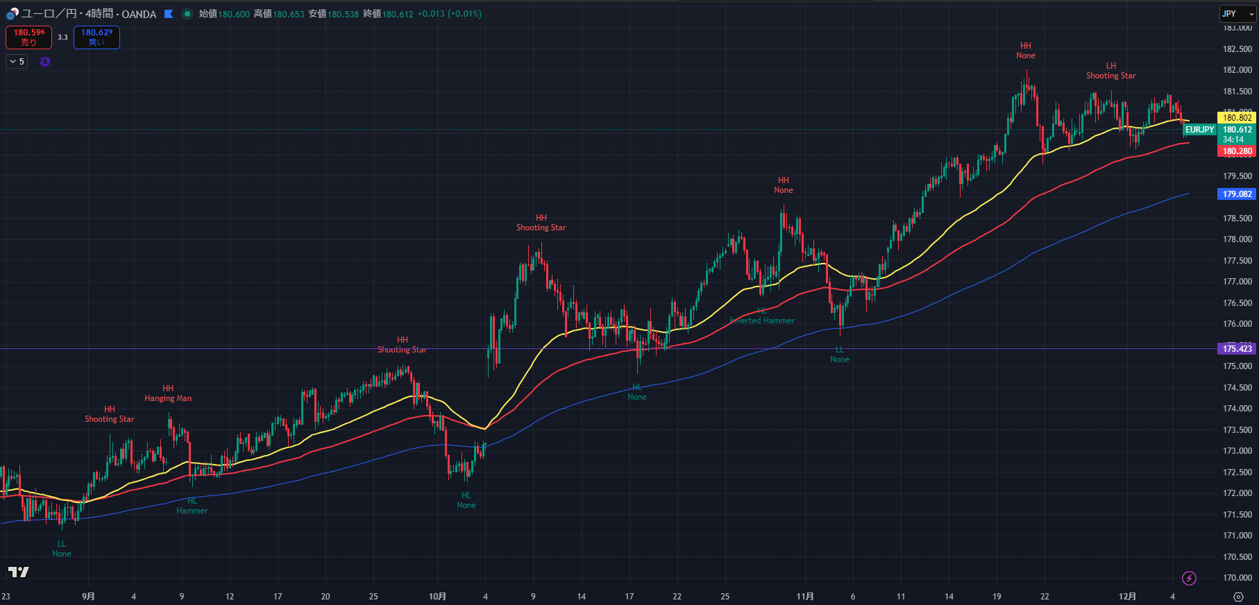 - 「ラスト押し安値」だった180.98を明確に回帰した場合、ダウ理論の崩れがダマシだったことになるため撤退します。