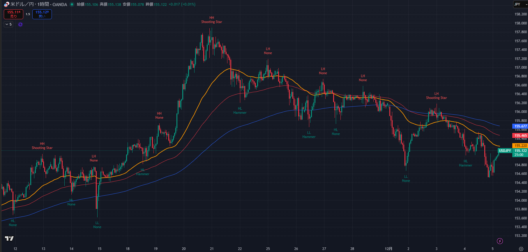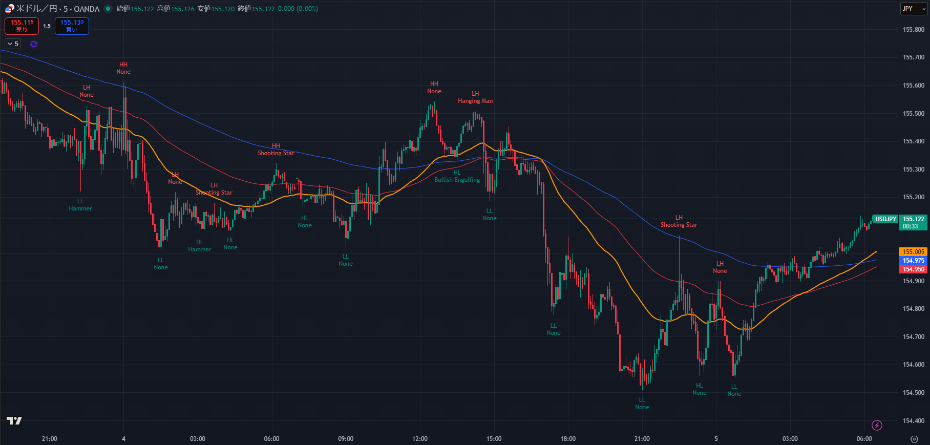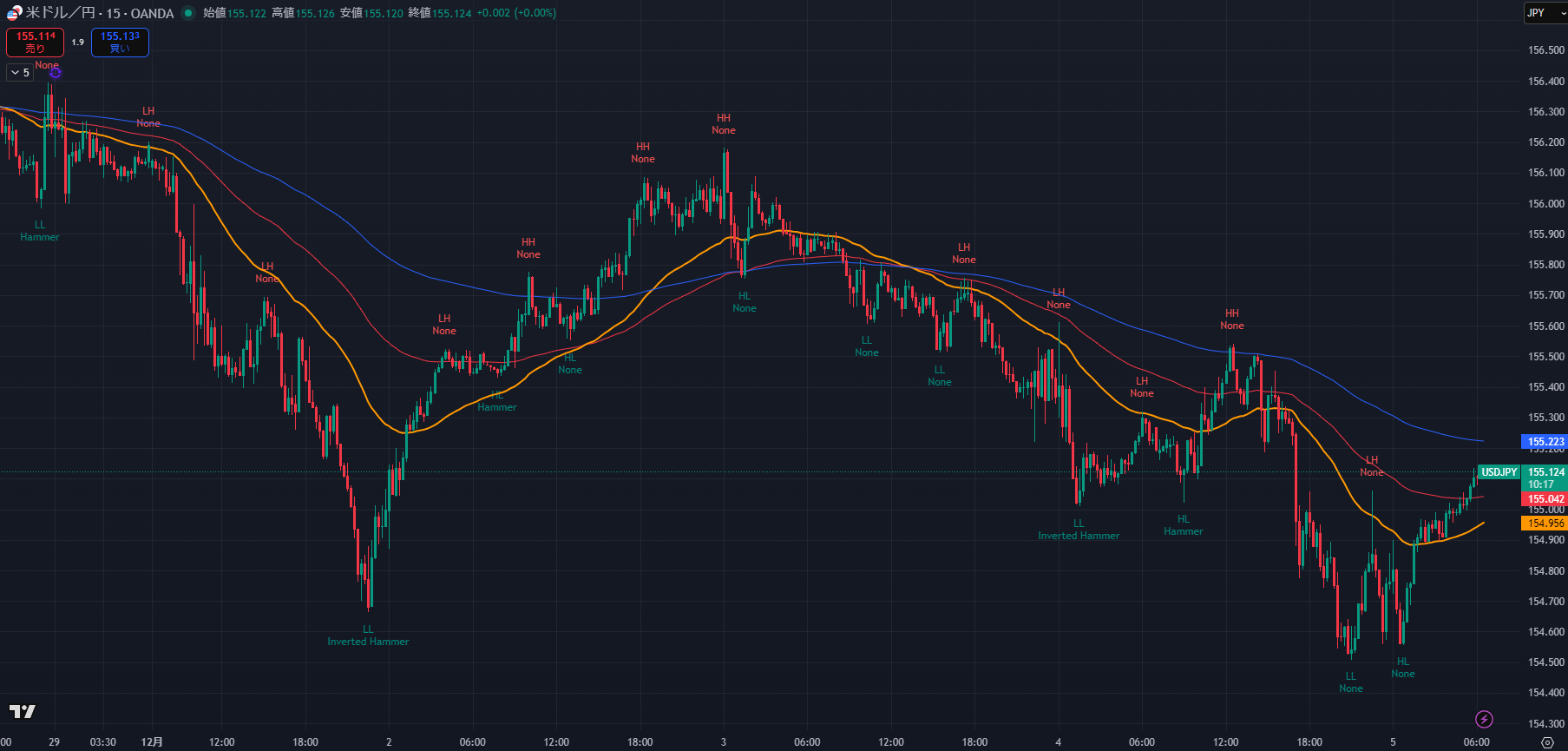 - 短期市場構造: 昨日の安値(154.543)をつけた後、現在は 155.00 – 155.20 の狭いレンジで推移しています。これは次の大きな動き(NFP等)を待つ「嵐の前の静けさ」です。 直近では、155.20付近で上値を抑えられており、ここでの**「包み足」や「長い上ヒゲ」**は絶好のショートサインとなります。