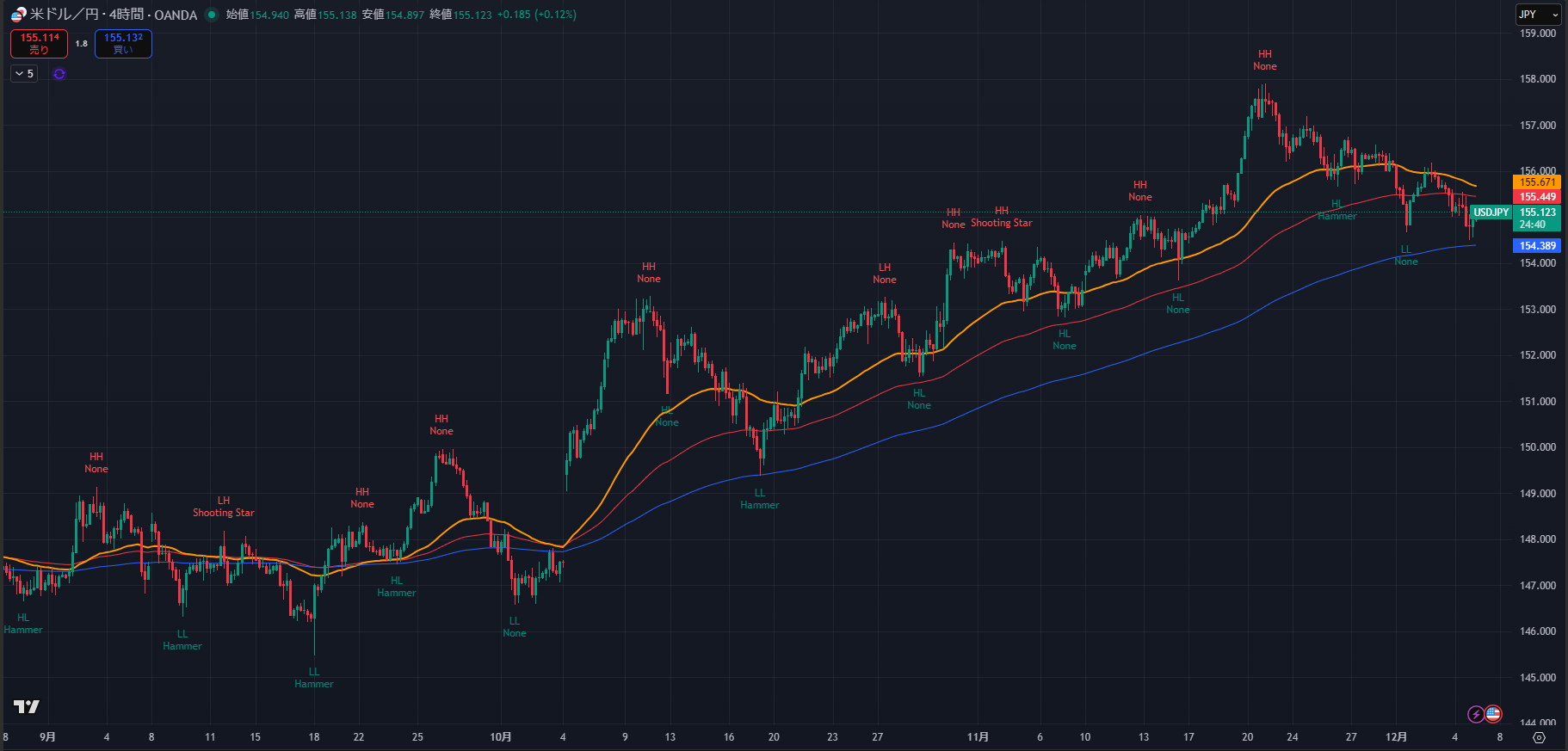 - ラスト戻り高値 (4H): 155.816(ここを上抜けるまでは、どんなに上昇しても「戻り」と見なす)