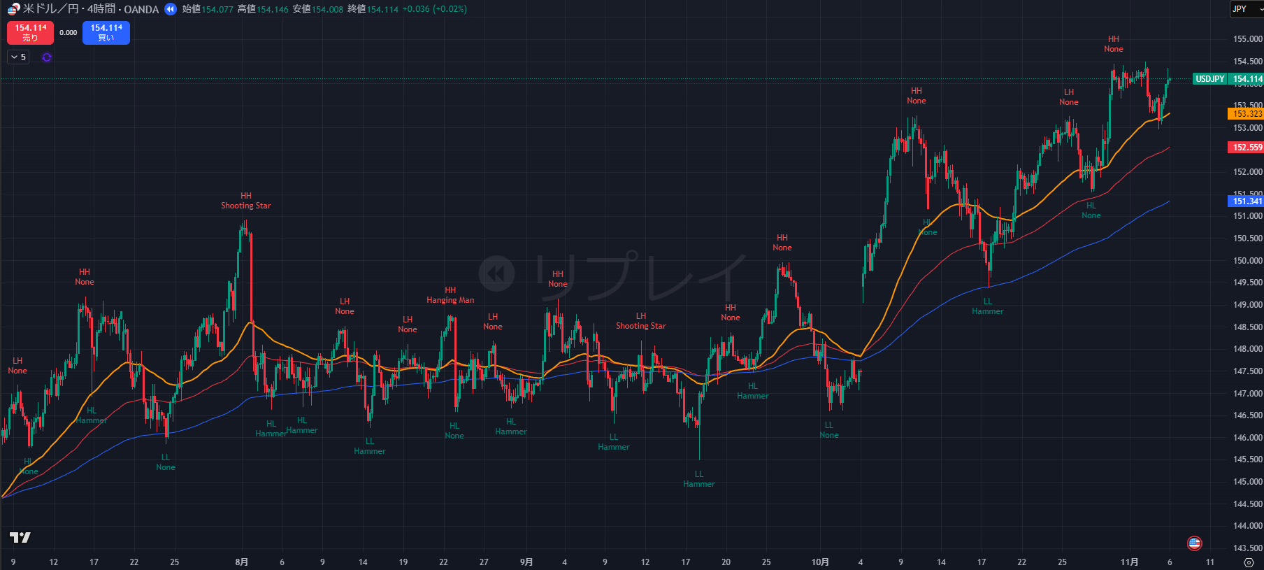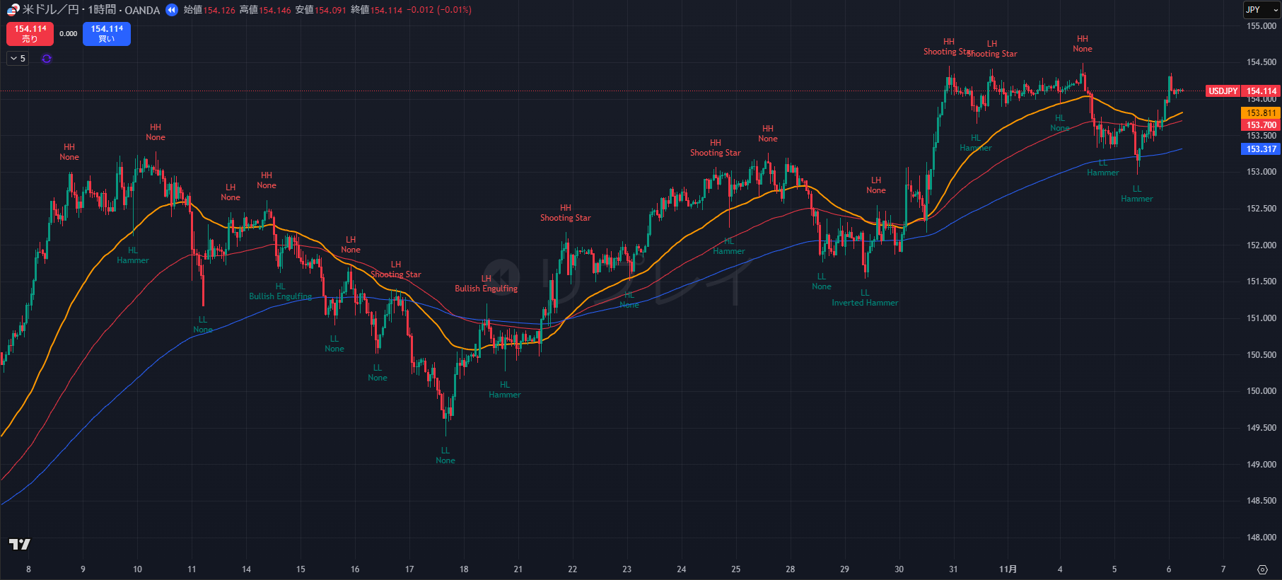 - ロングの罠: 11/4未明に付けた高値 154.48 (Major Swing High) を一時的に試しましたが、実体で定着できずに失速。ロングの条件であった「154.30の明確なブレイクとサポート転換」は満たされませんでした。