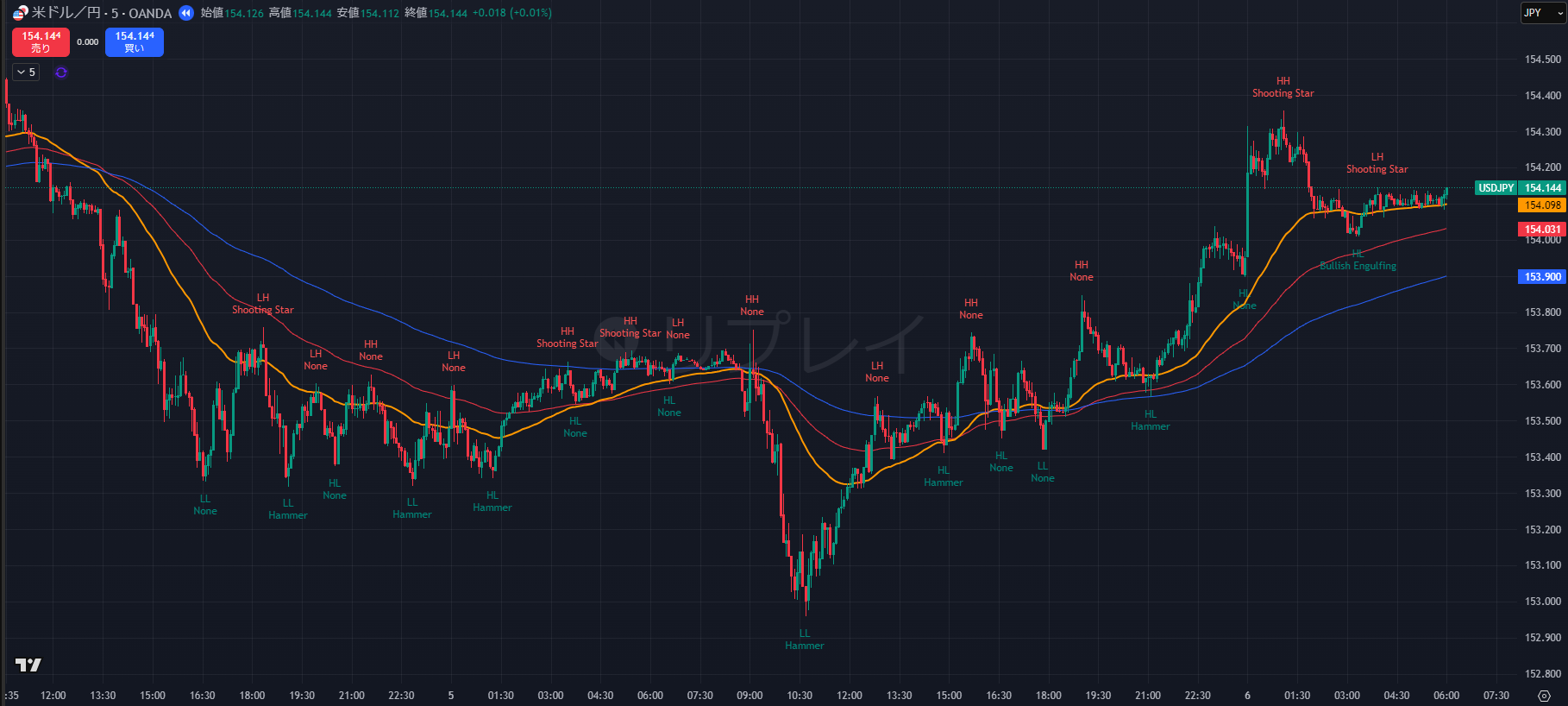 - 早朝から 153.37 を底にV字回復を見せ、5分足では一時的に上昇構造(Higher High / Higher Low)を作っています。