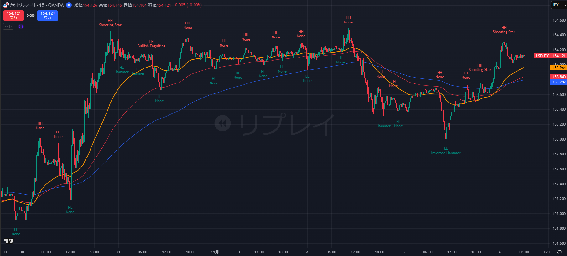 - 154.15付近で上ヒゲ(Shooting Star)が頻発する場合、買い手の疲弊を示します。